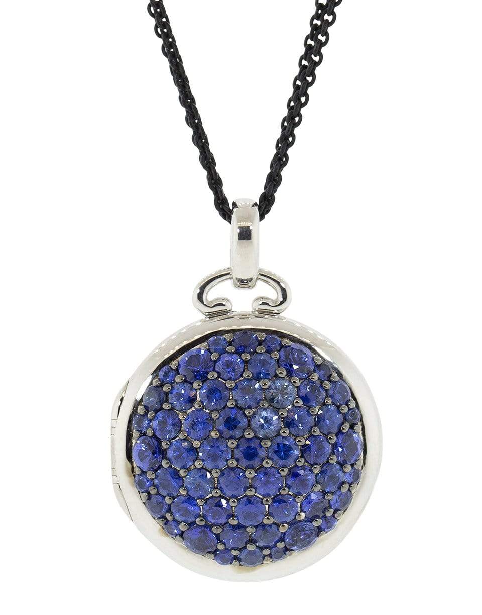Monica Rich Kosann special edition "Perfect Pave" locket with blue sapphires on a blackened setting suspended from a 32" double black steel chain.