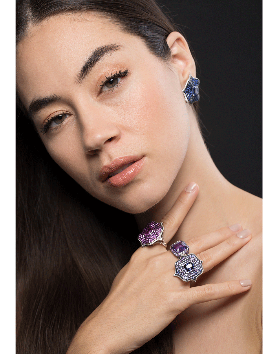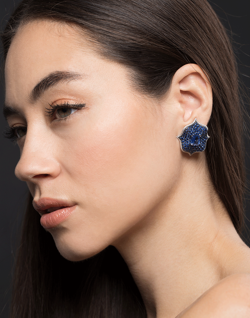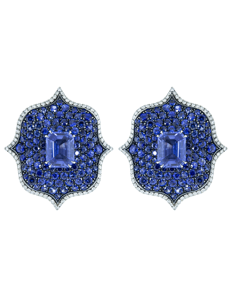 Bayco Lotus earrings with two natural unheated emerald cut burmese blue sapphires, round brilliant cut ceylon sapphire pave and colorless diamonds.