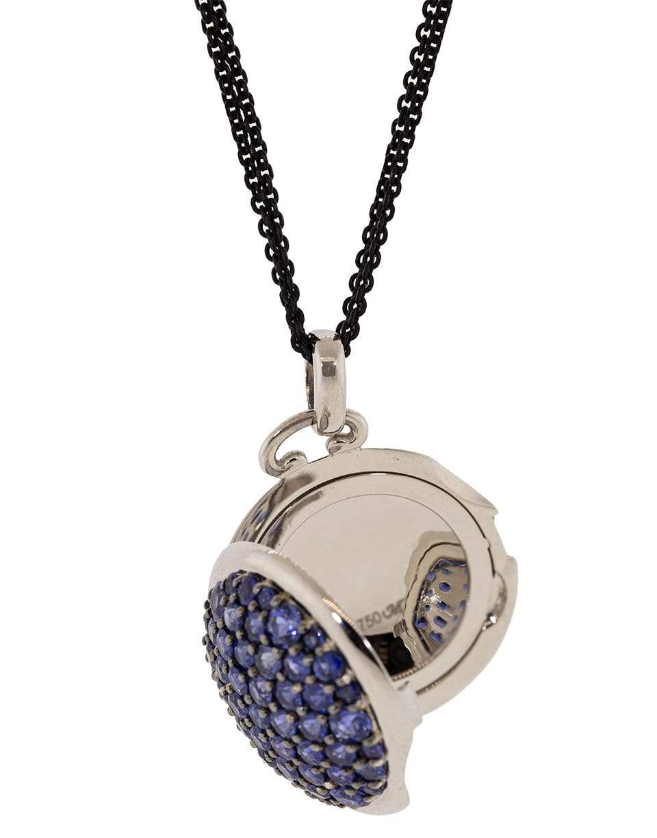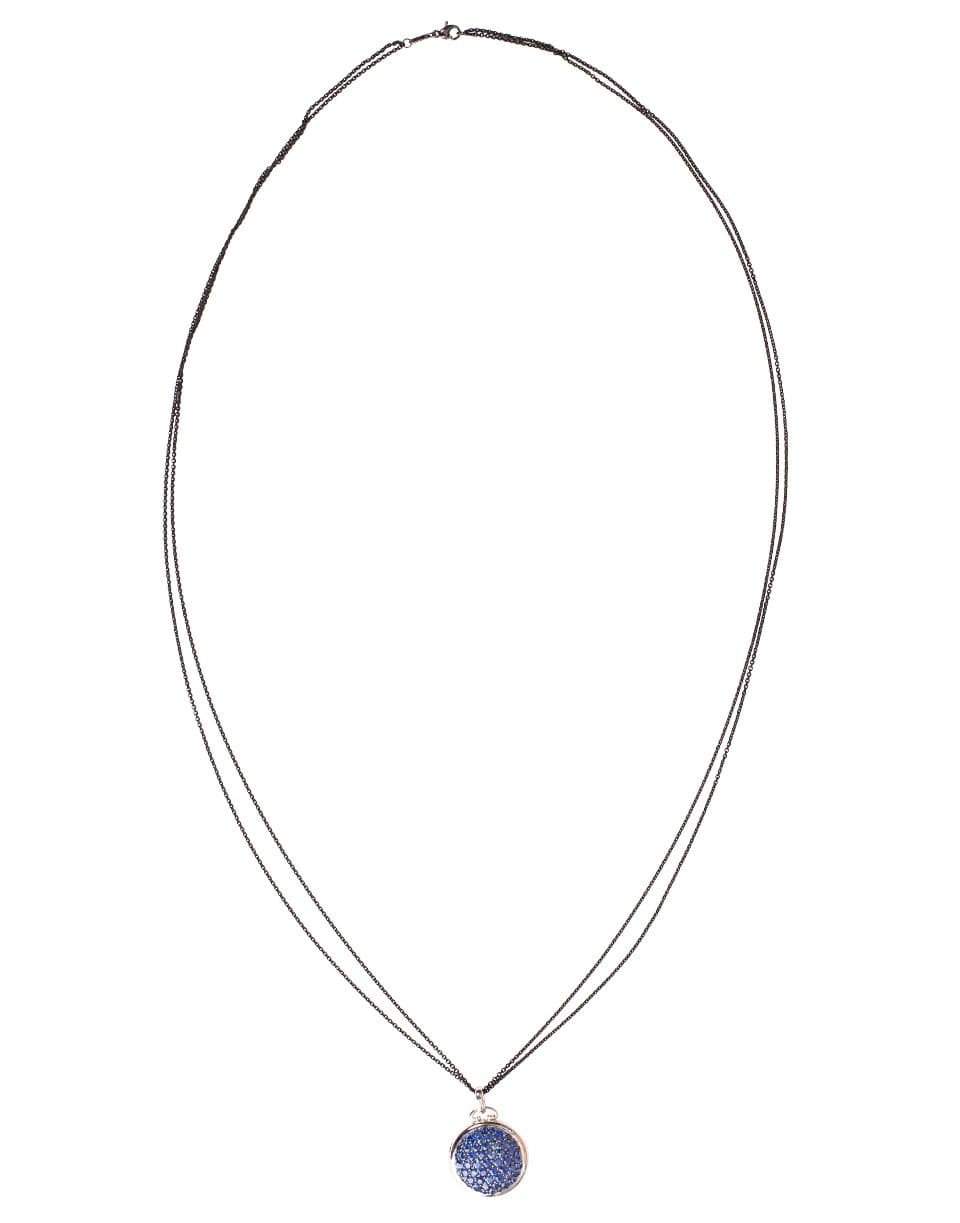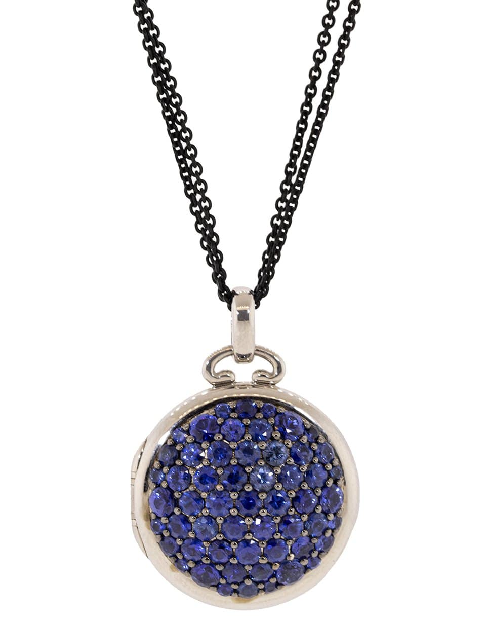 Monica Rich Kosann special edition "Perfect Pave" locket with blue sapphires on a blackened setting suspended from a 32" double black steel chain.