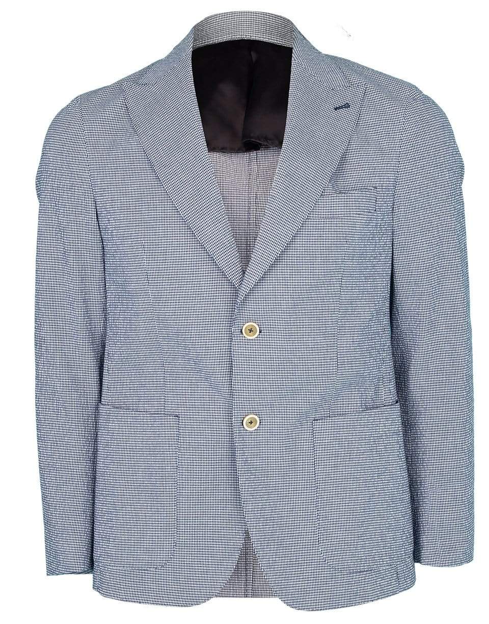 Eleventy blue single breasted jacket with a slim fit, notched lapels, front patch pockets, button fastening, and long sleeves.