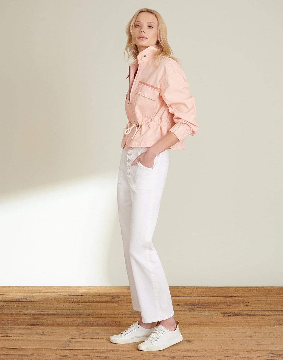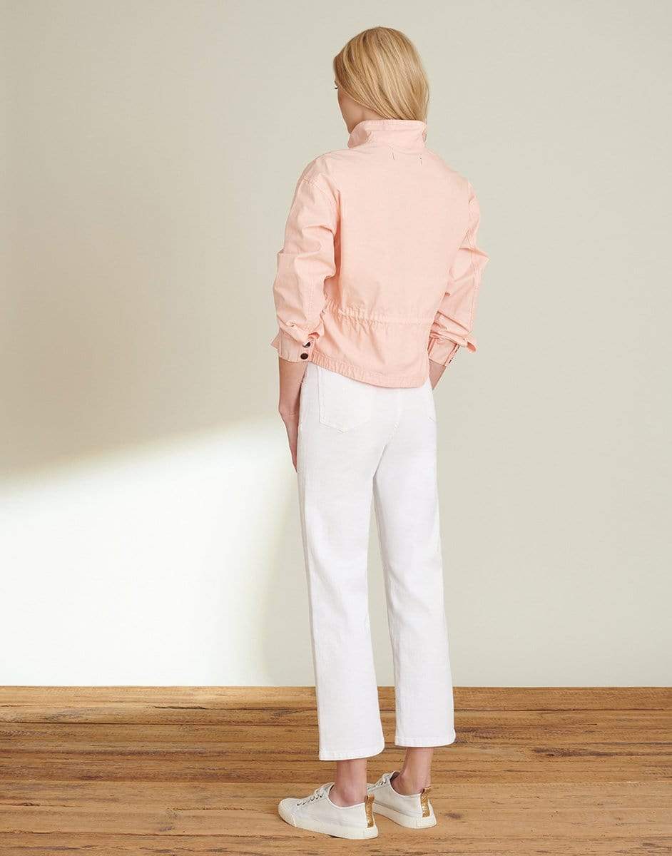 Veronica Beard Roz jacket in cotton is the lightweight layer you need. With flap pockets and a drawstring waist, it offers you chic utilitarian style. Pair with straight-leg jeans and sneakers for a casual-cool look. High neck with snap button. Flap pockets. Drawstring waist. Long sleeves.