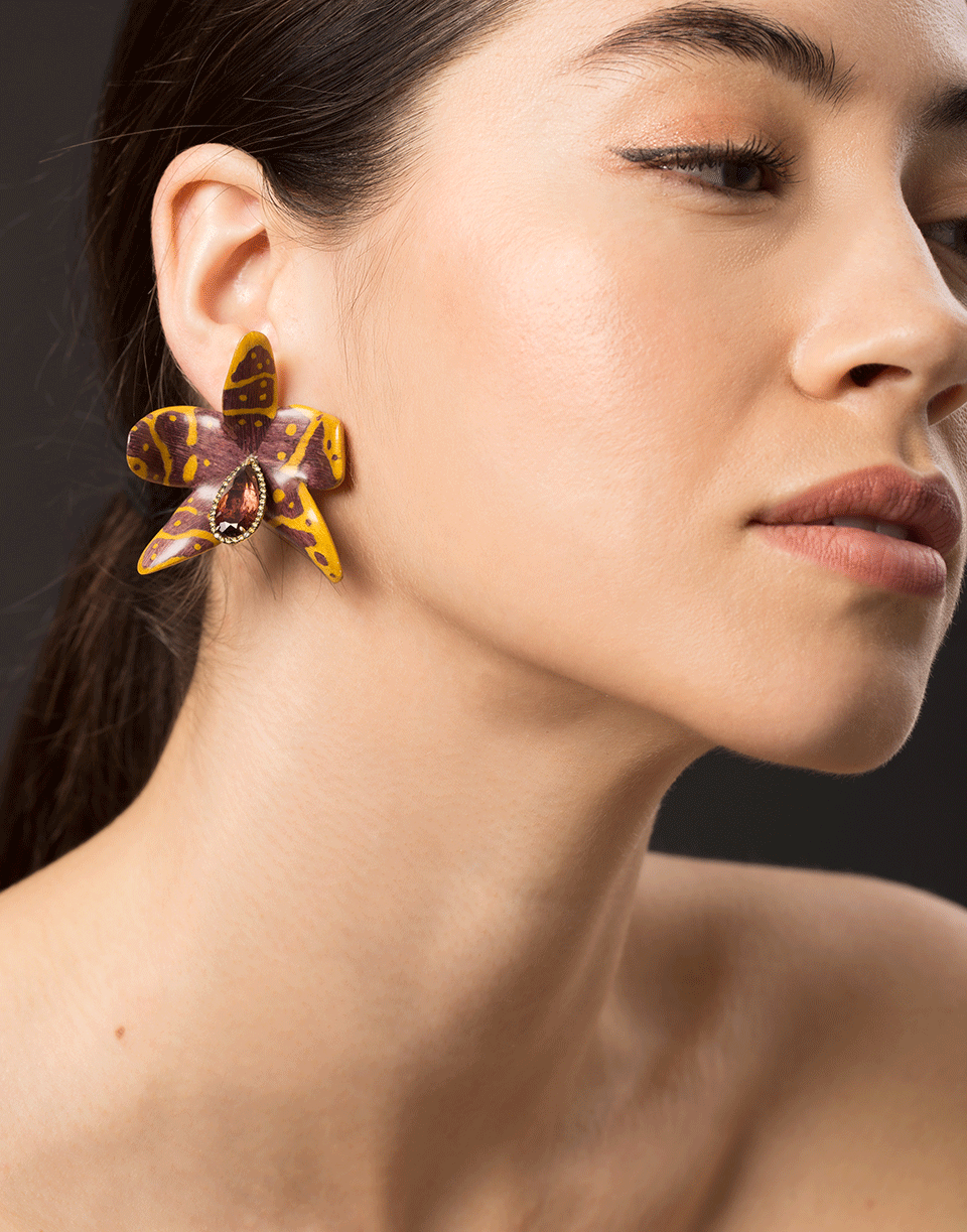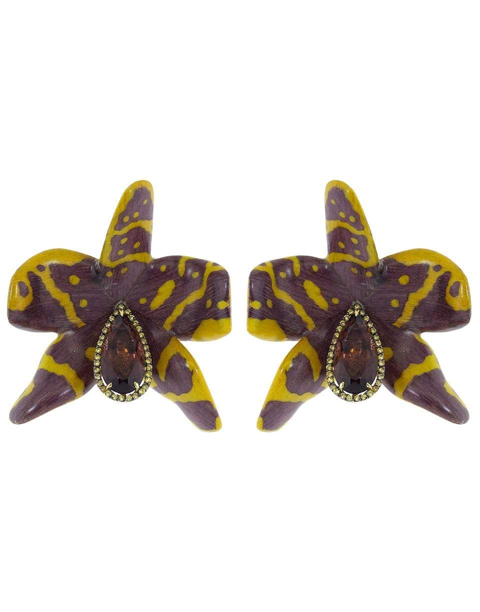 Silvia Furmanovich sculptual botanical marquetry purple and yellow orchid earrings with yellow diamonds, brown tourmaline, and yellow sapphires set in 18k yellow gold. For pierced ears.