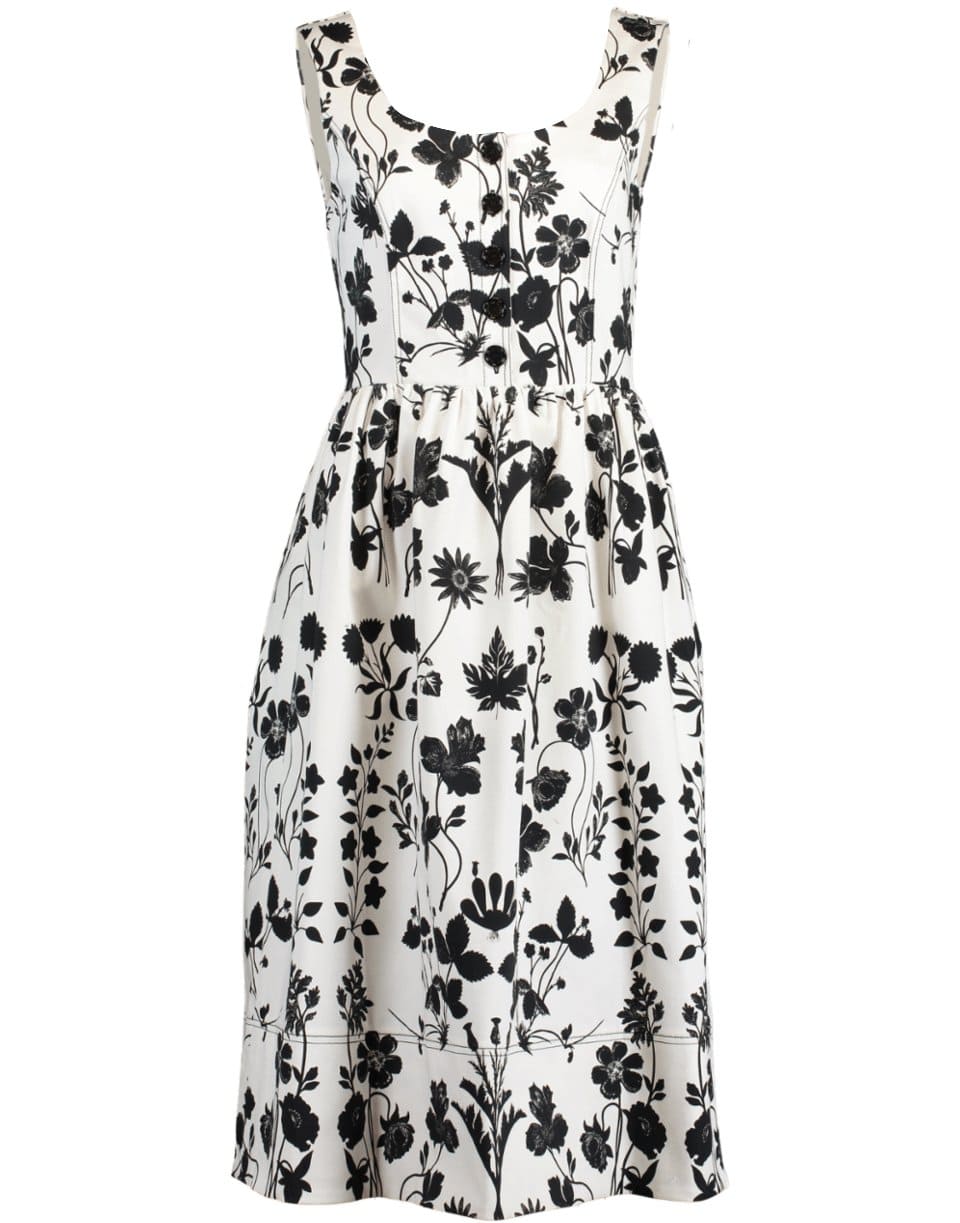 Cotton twill botanical print dress from Oscar de la Renta featuring a sleeveless silhouette with a fitted bodice, scoop neck, five button front, full pleated skirt with side pockets, concealed zip closure at back, and a mid-length.