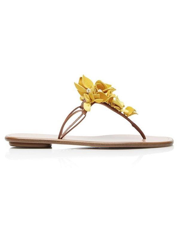 Drawing on the expertise that he gained while studying at Central Saint Martins, Aquazzura creative director Edgardo Osorio conjures an ethereal mood with these white Bougainvillea flip flops. They're crafted from smooth leather with slim straps accented by silver floral appliqué, then set on a barely there sole with a small stacked heel.