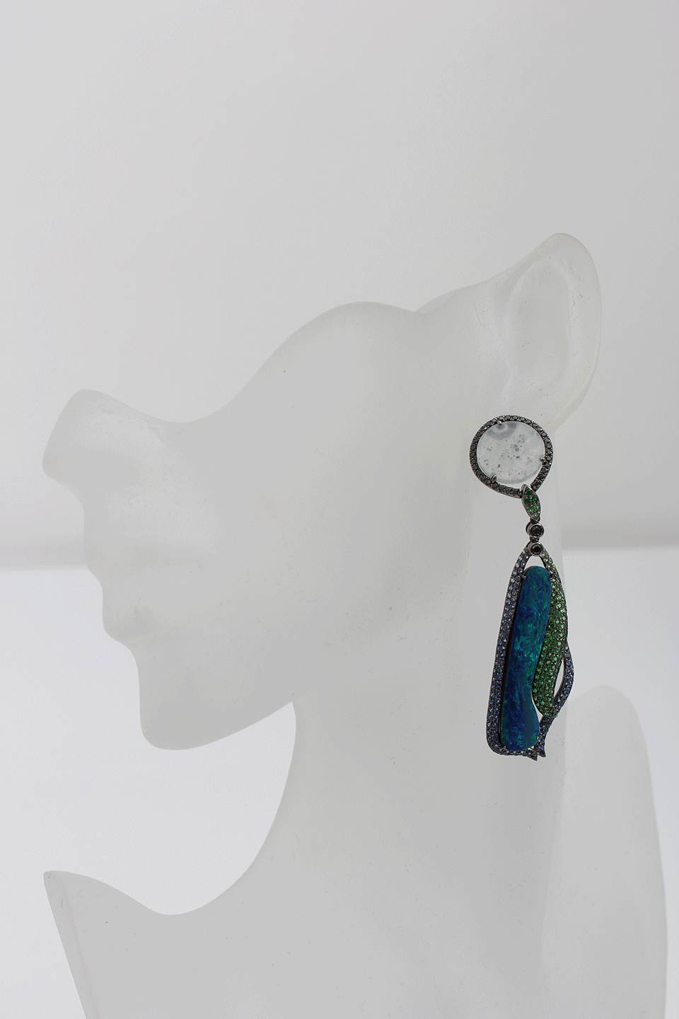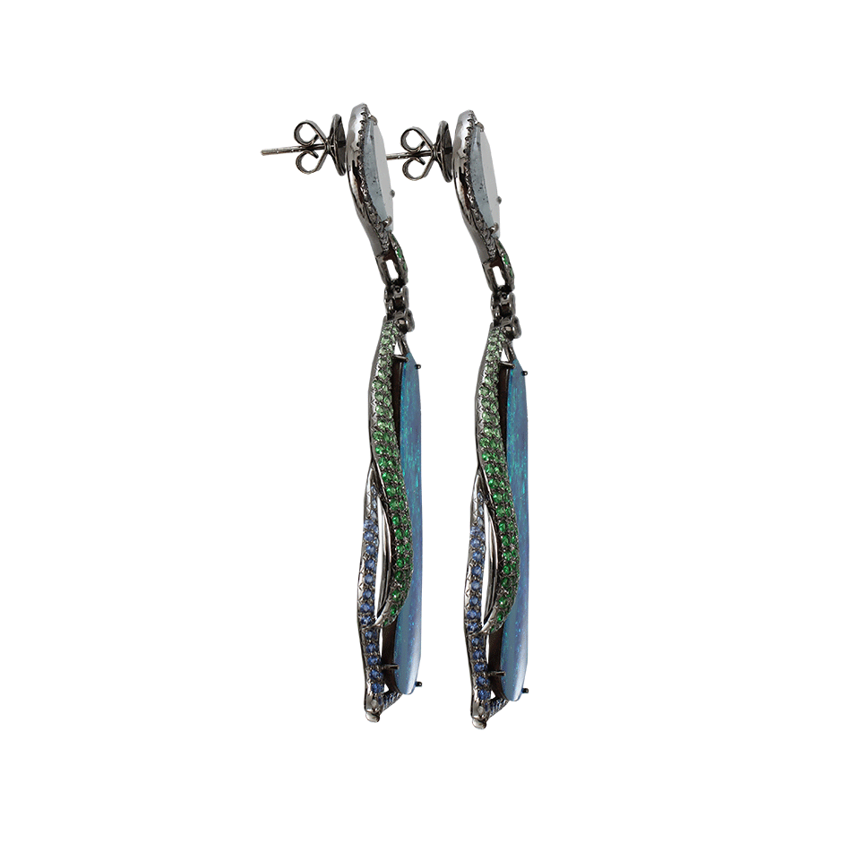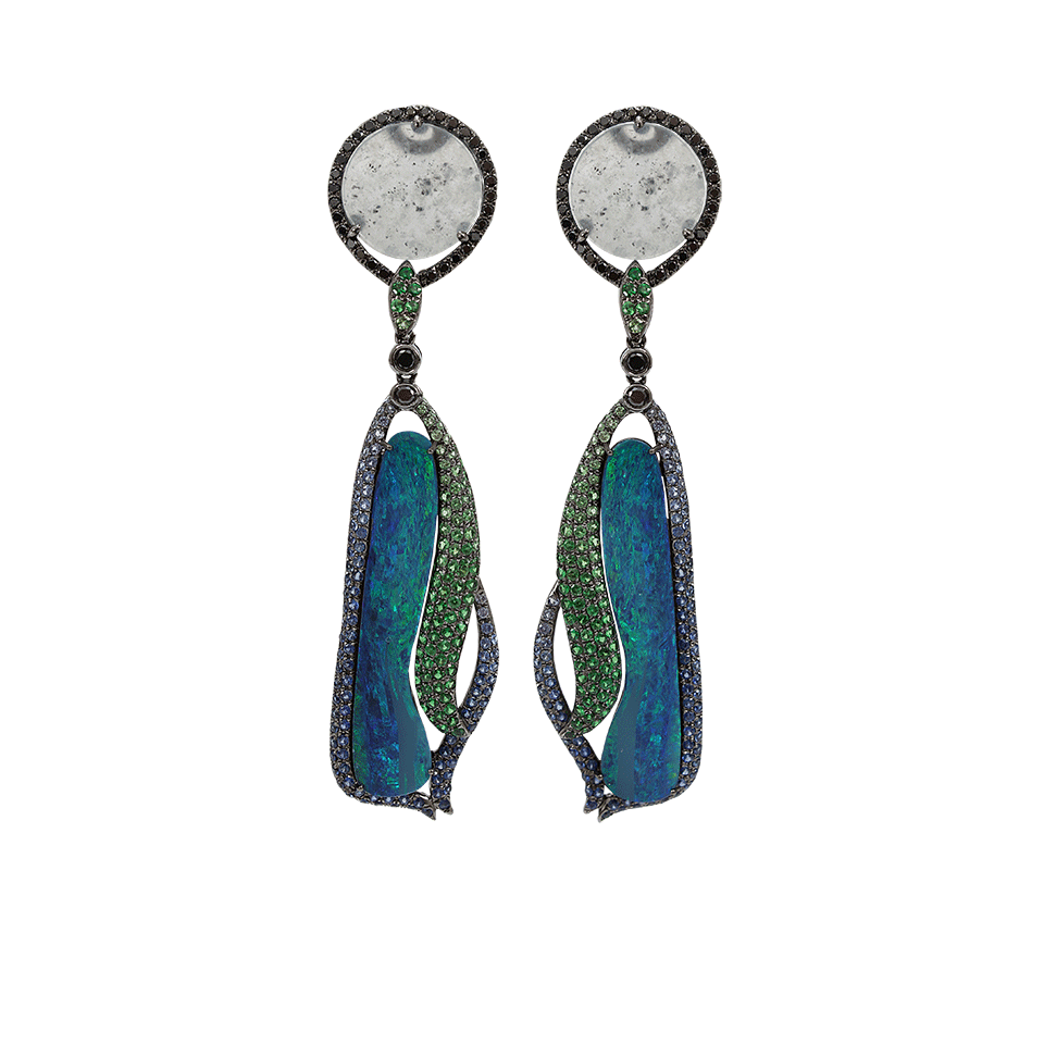 Bold and blue in all their glimmering glory, Wendy Yue’s boulder opal earrings are a must-have addition to any fashionista’s jewelry box. Post Earrings 3” x 0.75” Boulder Opal (22.27 CTW), Jade (10.76 CTW) Tsavorite (2.19 CTW), Sapphire (2.15 CTW) Black Diamonds (1.88 CTW) Available in 18K Black Gold