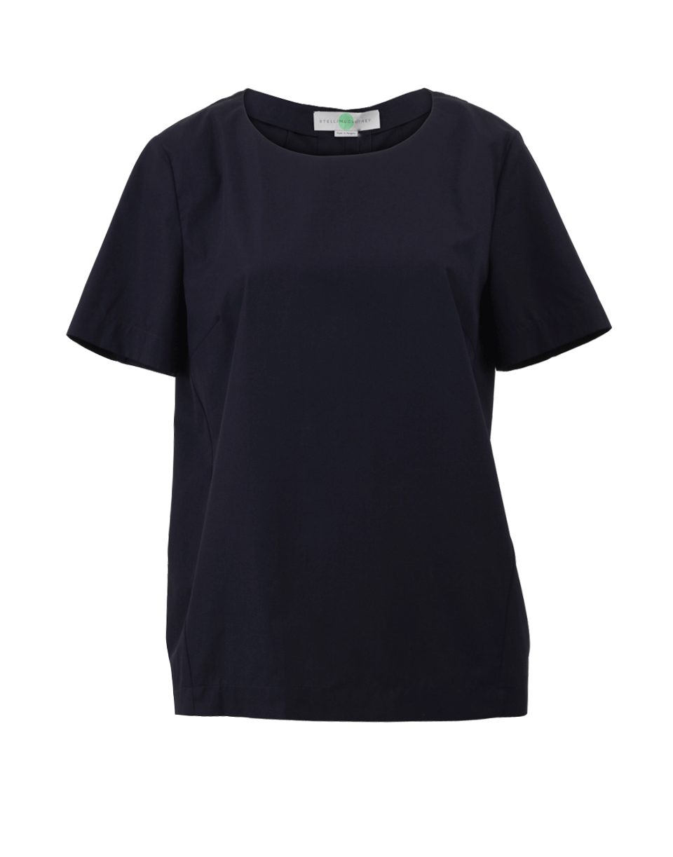 Jewel Neckline With Short Sleeves, Asymmetrical Dart Stitching, And Open Back
