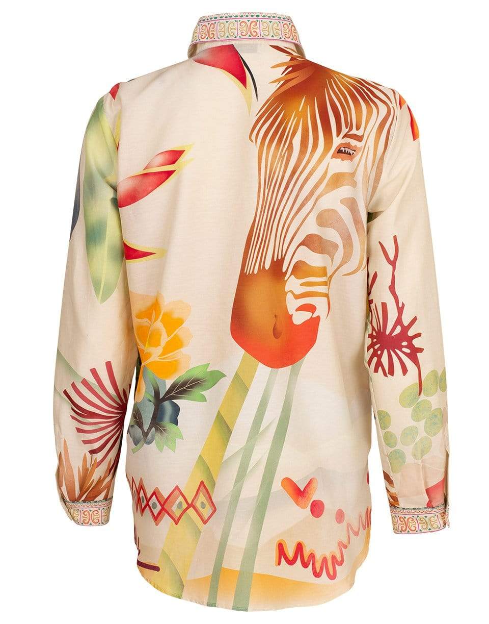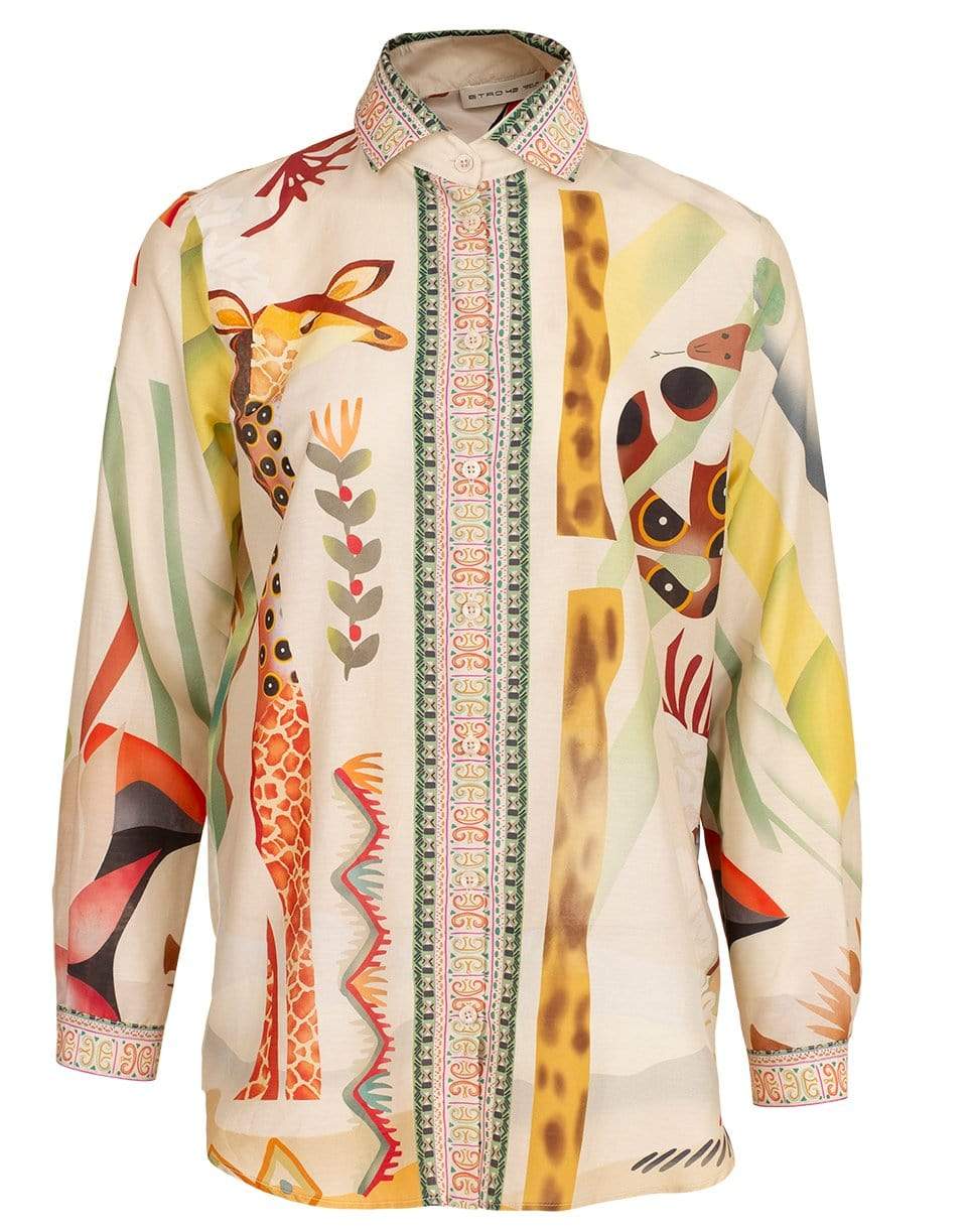 Etro animal print blouse with a boyfriend fit, long sleeves, spread collar, and a concealed button placket.
