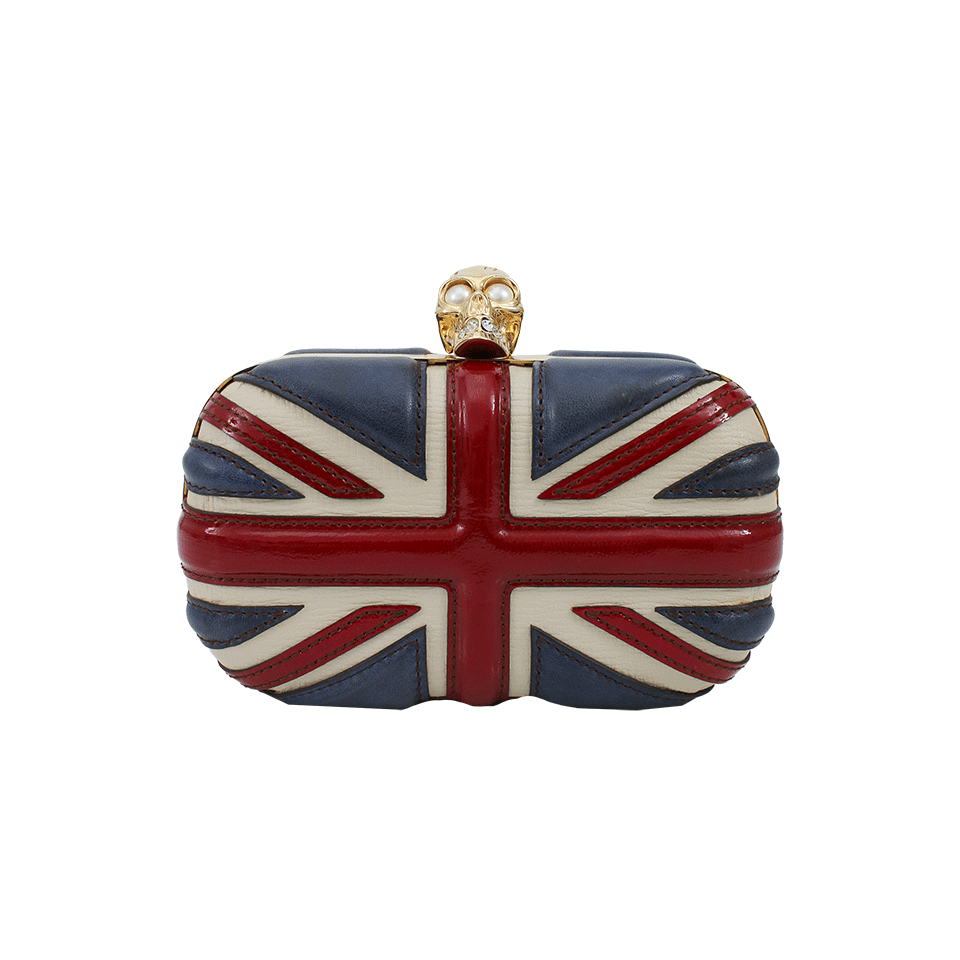 In waves of red, white and blue; Alexander McQueen's Britannica skull clutch is a bold treasure. Bring studded glory to any ensemble with the accent of this gorgeous clutch. 6.75” x 4” x 2” Leather Available in Ivory/Red