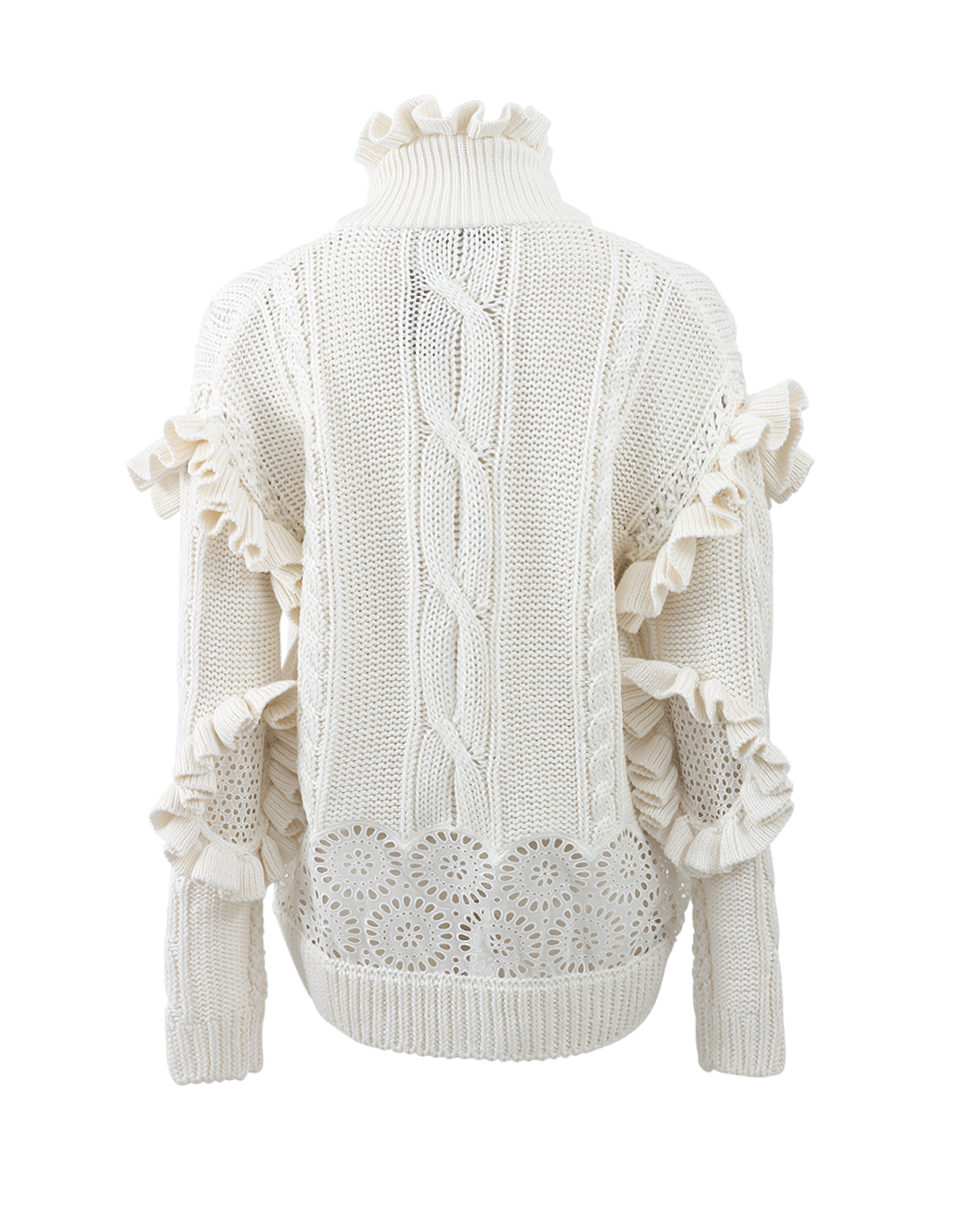 Ruffle Turtleneck With Two-Way Zip Closure, Center Ruffle Detail With Lace Insets, Side Pockets