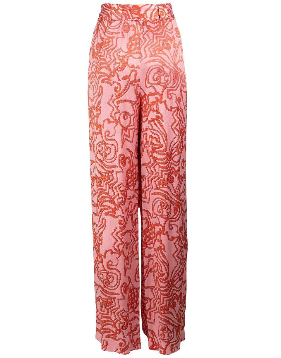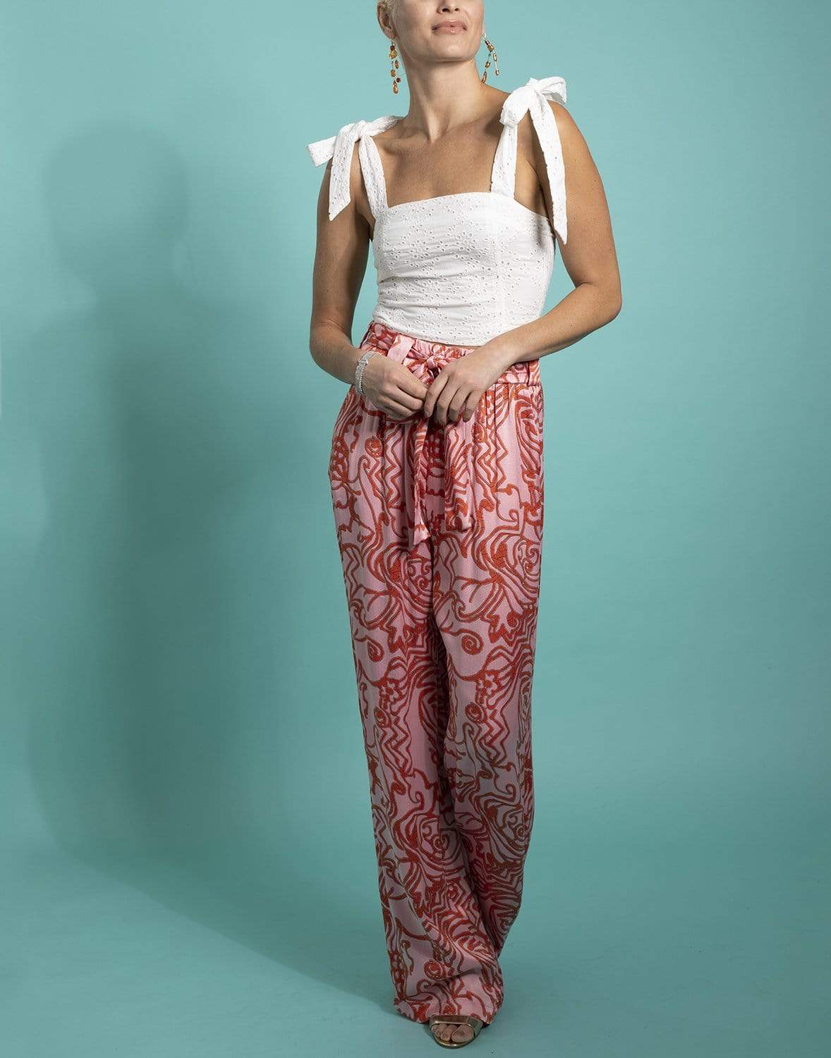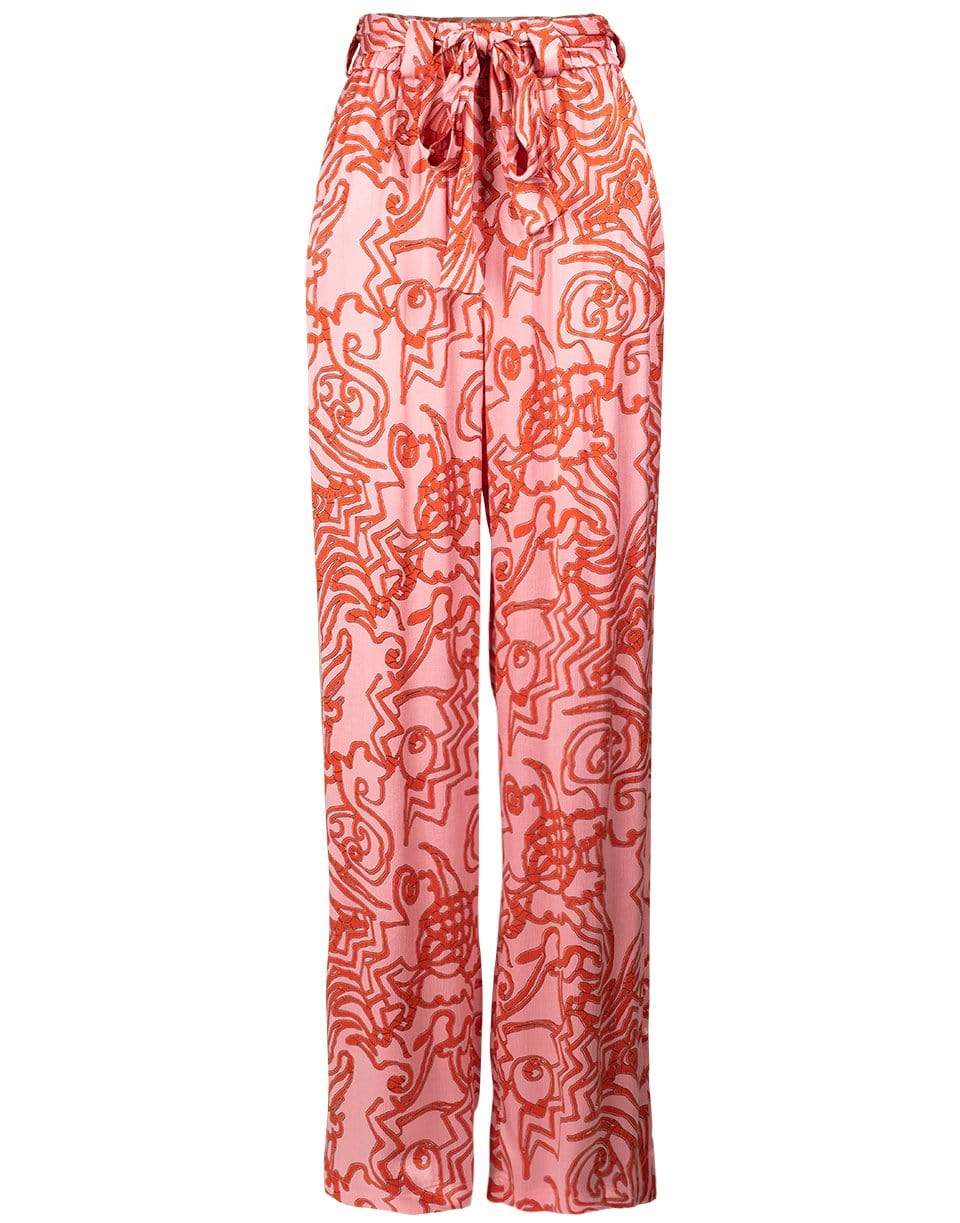 Alexis bronzin pant in vermillion. The Bronzin Pants have an easy straight-leg silhouette printed with this season's fluid reef motif. The elastic waist and sash belt make this an effortless piece to throw on day or night. Style it up with your favorite white blouse or down with a comfy sweater for cool September nights.