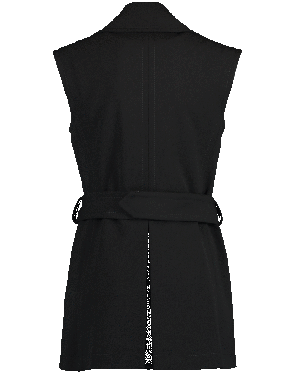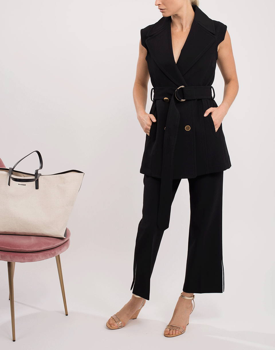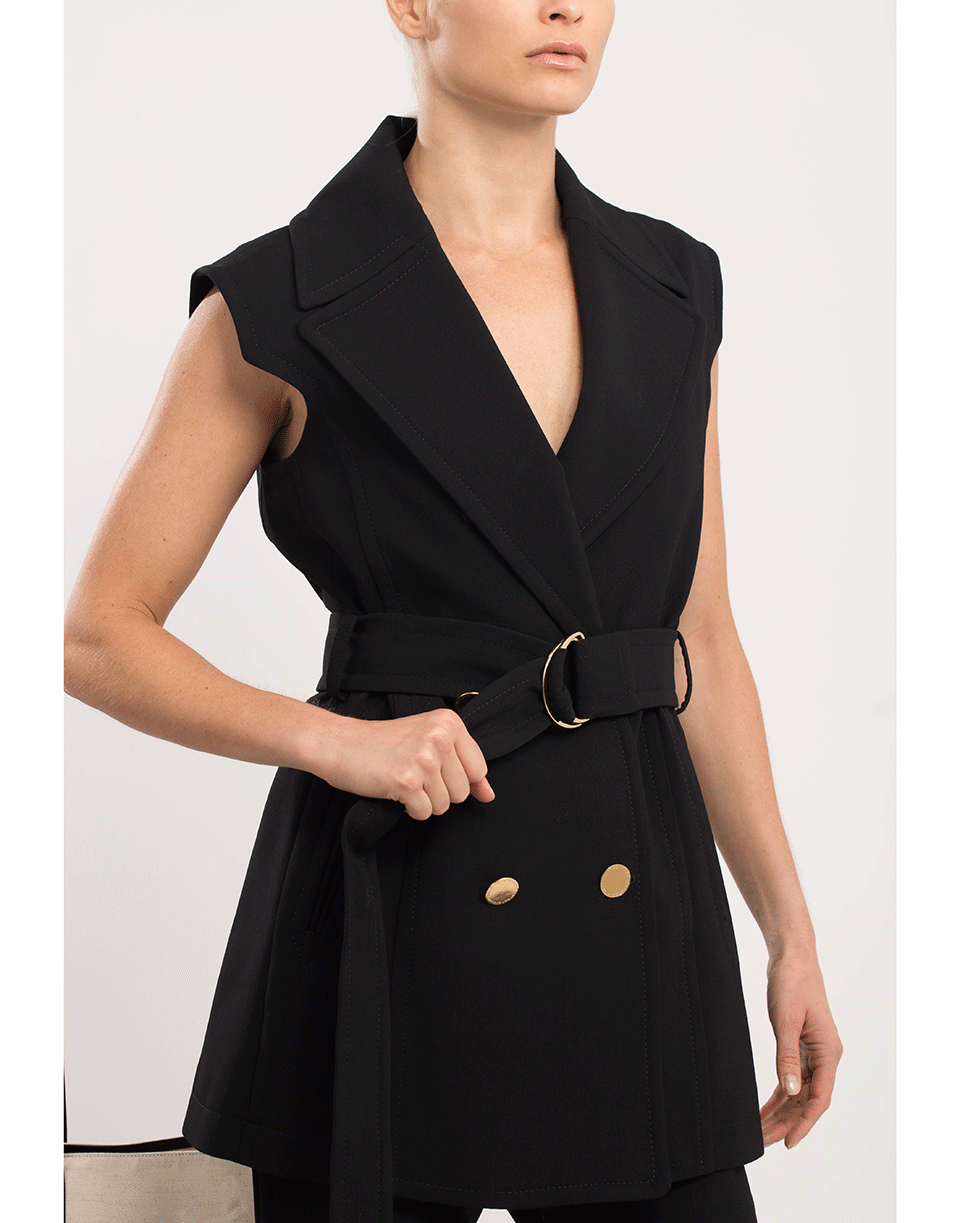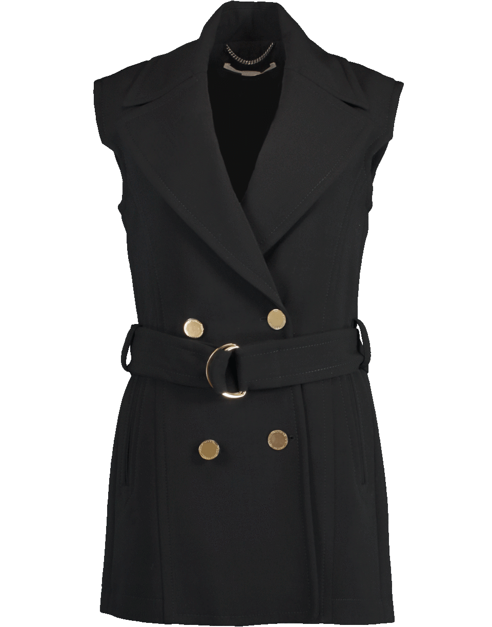 The Bruce double-breasted waistcoat from Stella McCartney features a sleeveless design with notched lapels, a belted waist, two front pockets, and a fitted silhouette.