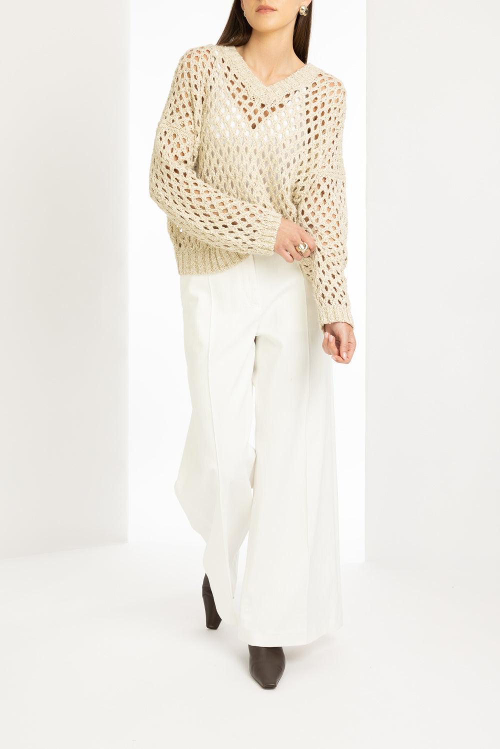 Brunello Cucinelli pailette v-neck sweater in cream.