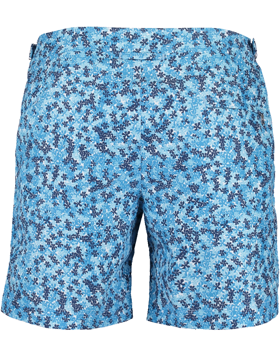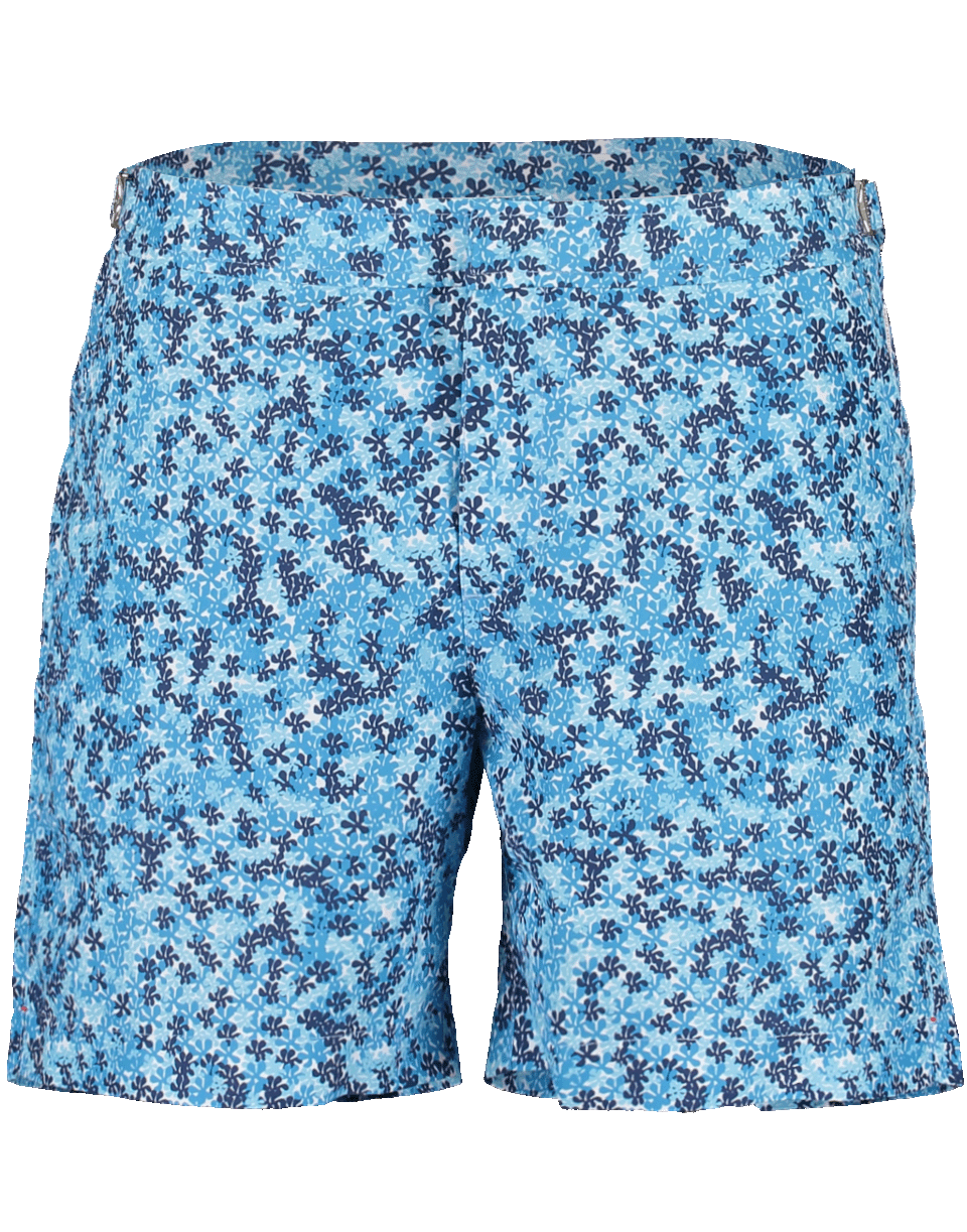 Printed Bulldog mid-length swim short by Orlebar Brown. This tailored swim short features an effortless style with quick-drying polyamide fabric, concealed front zip and button, back pocket with zip, adjustable metal side fasteners for desired fit and a blue and white floral print.