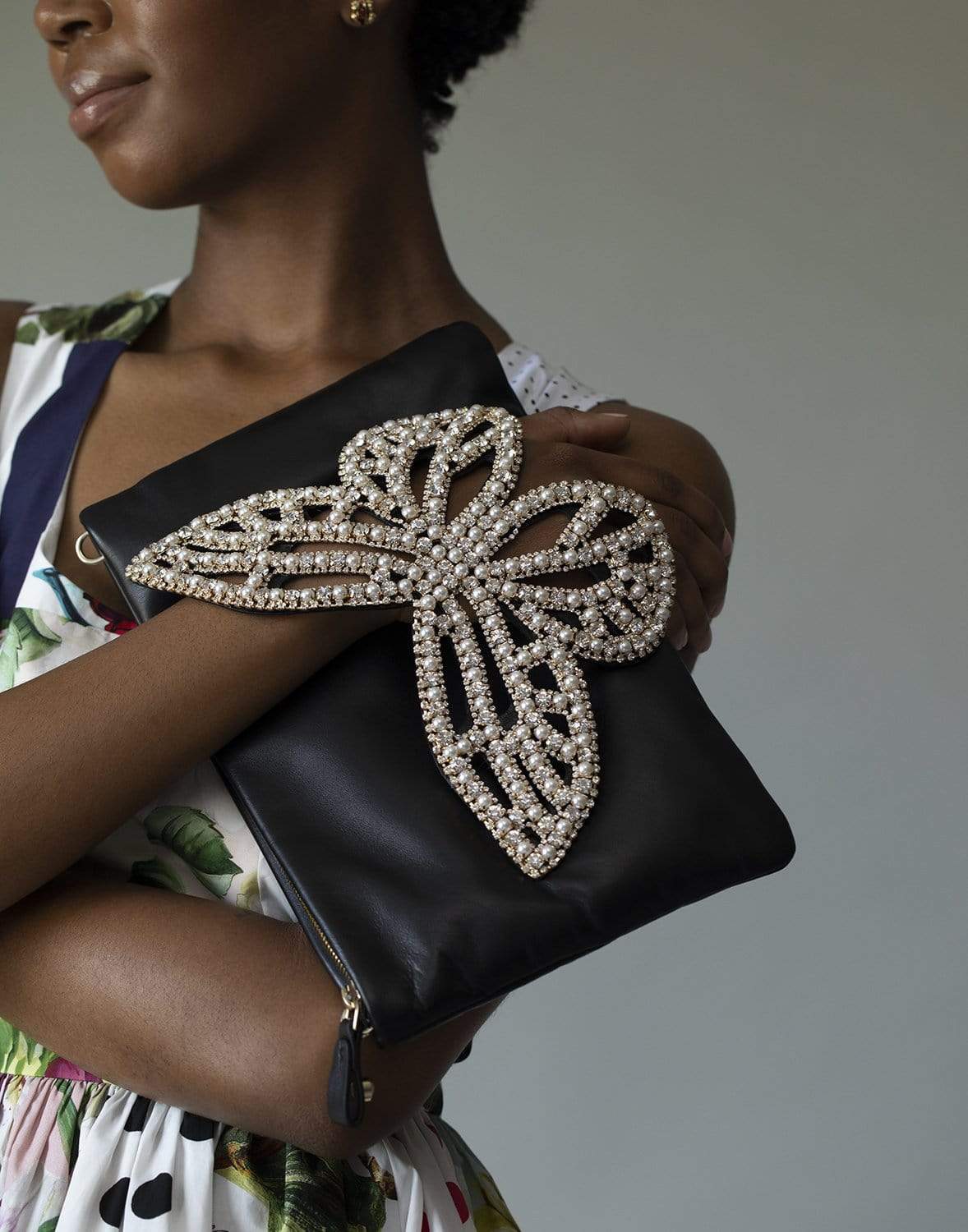 The Sophia Webster signature Flossy has been revamped for the new season. Their design team has worked hard to improve the size and shape of the Flossy meaning you can fit more in it. In black leather with embellished pearl details, this beautifully finished Flossy butterfly clutch bag is the perfect match for any occasion look. Can be worn with your hand through the butterfly as a handle, or it also comes with a long metal strap for wearing over your shoulder.