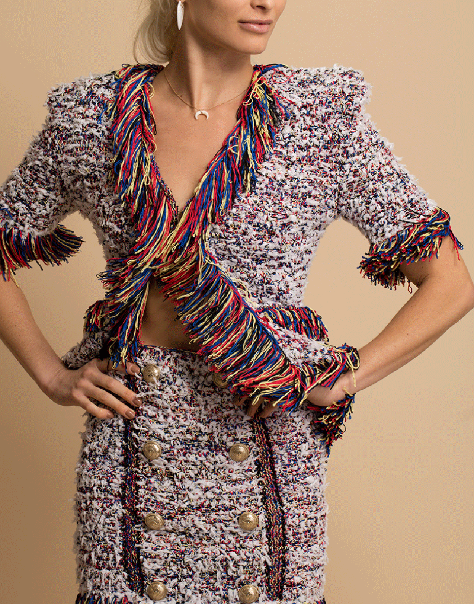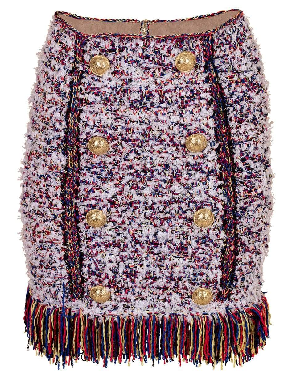 Balmain fringe tweed skirt with front buttons, exposed back zip, fringe hem, slim fitting silhouette, and knee length cut.