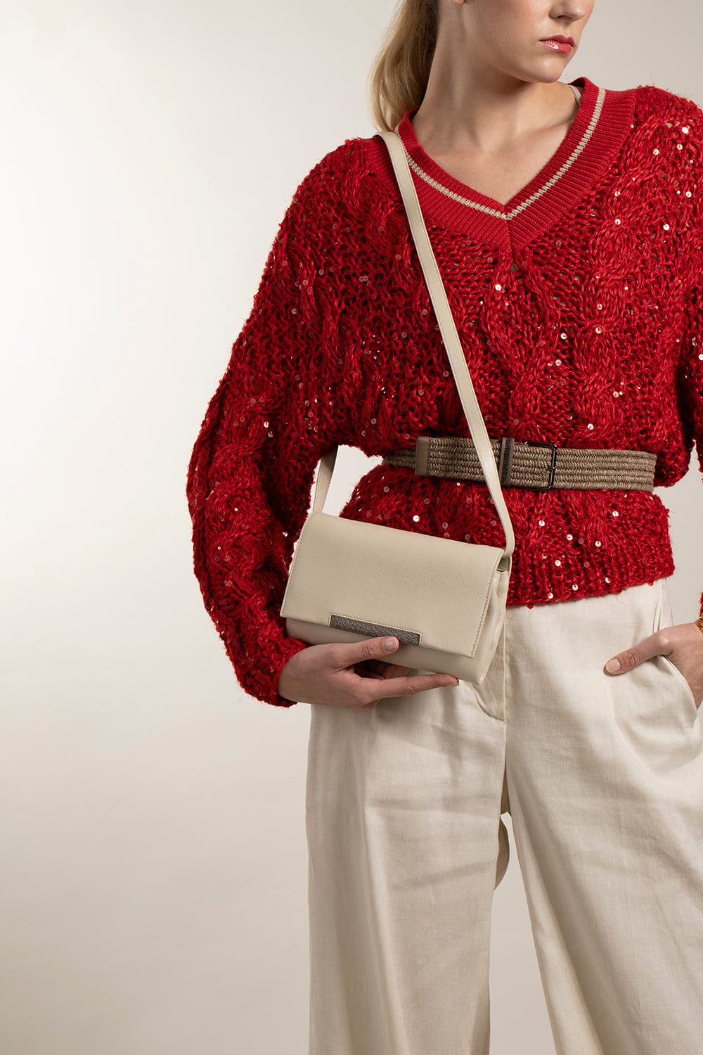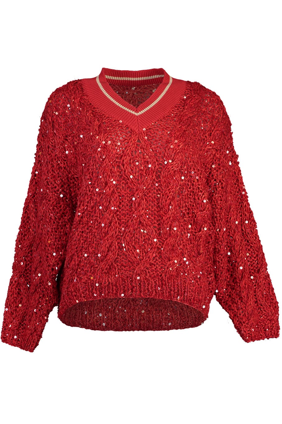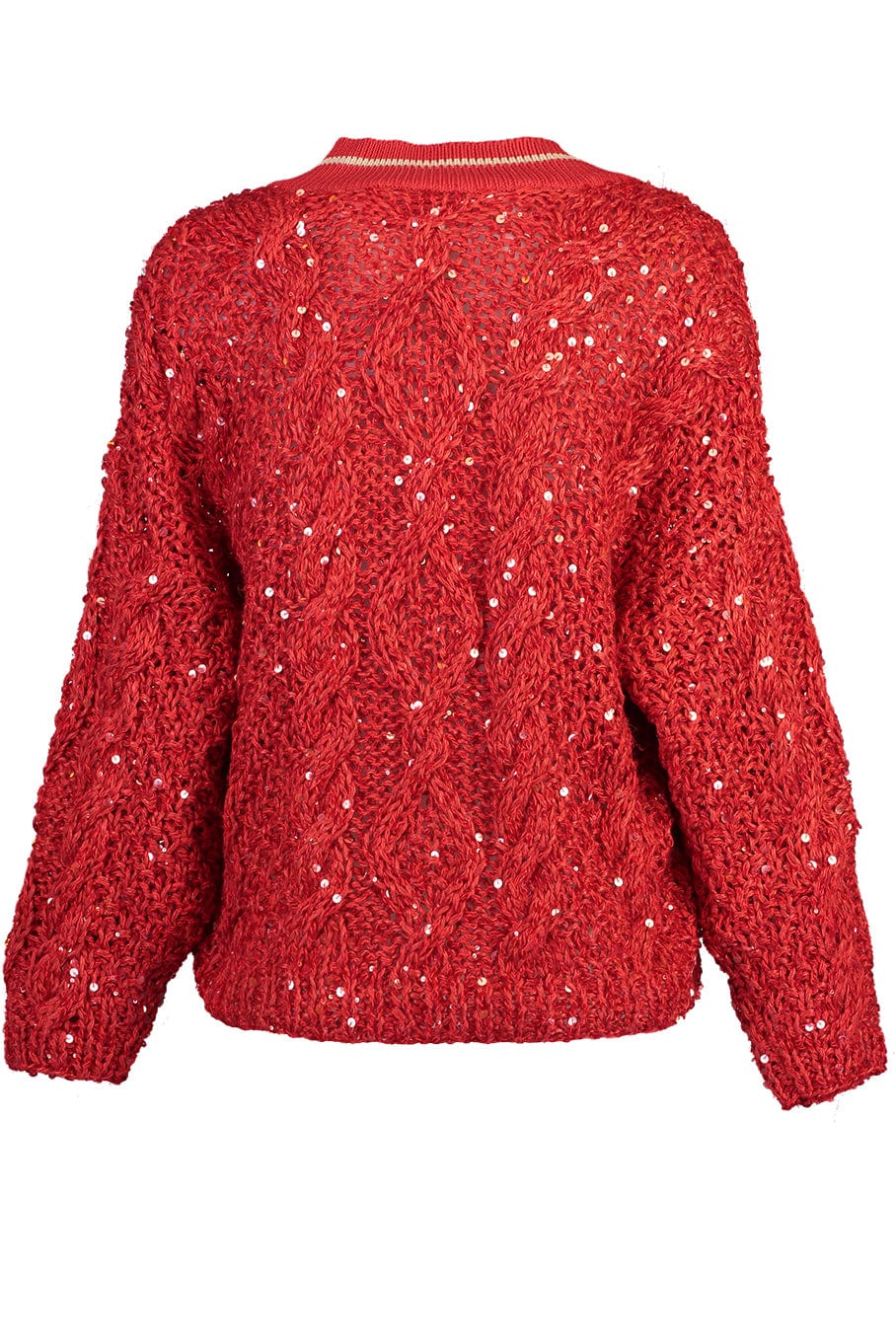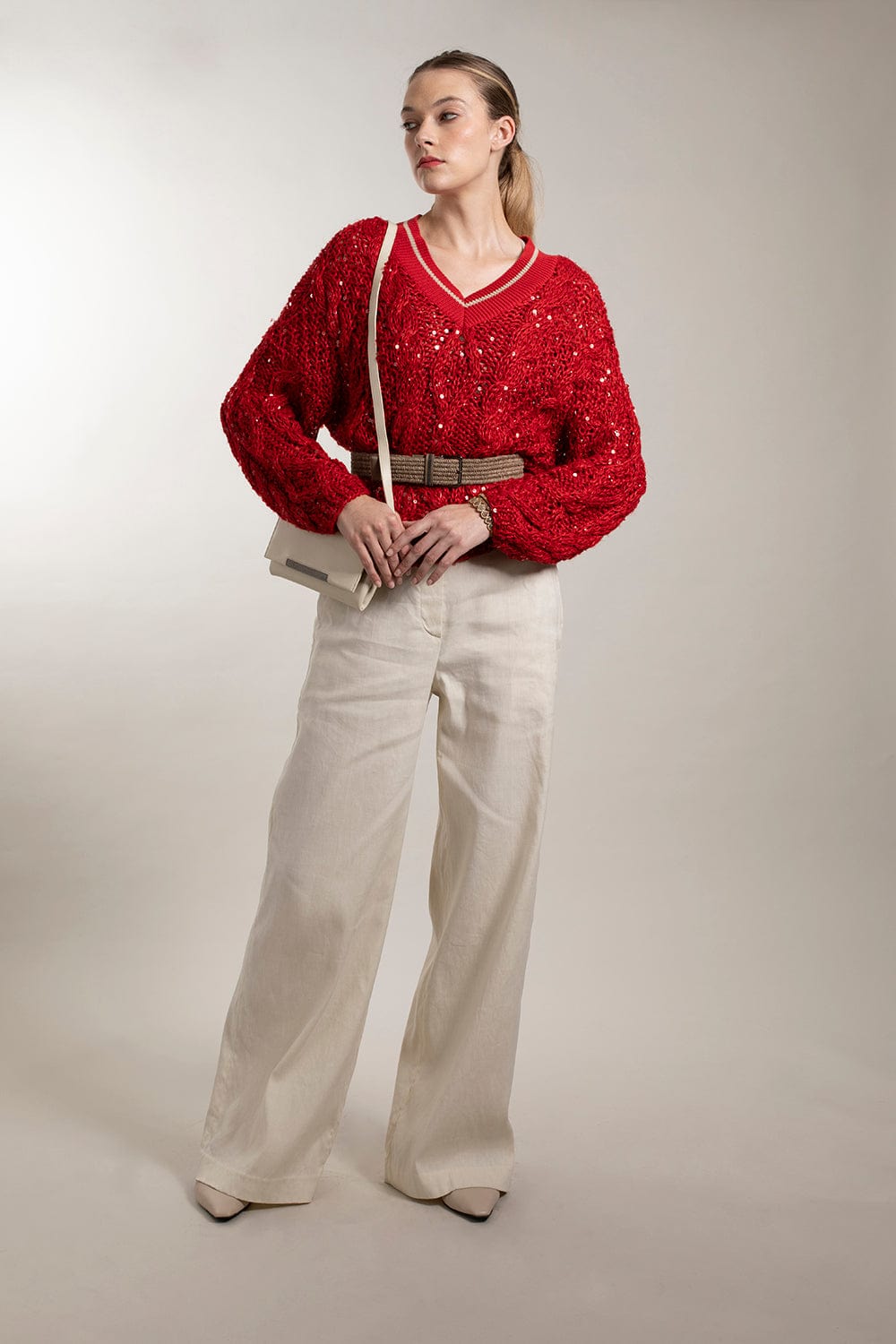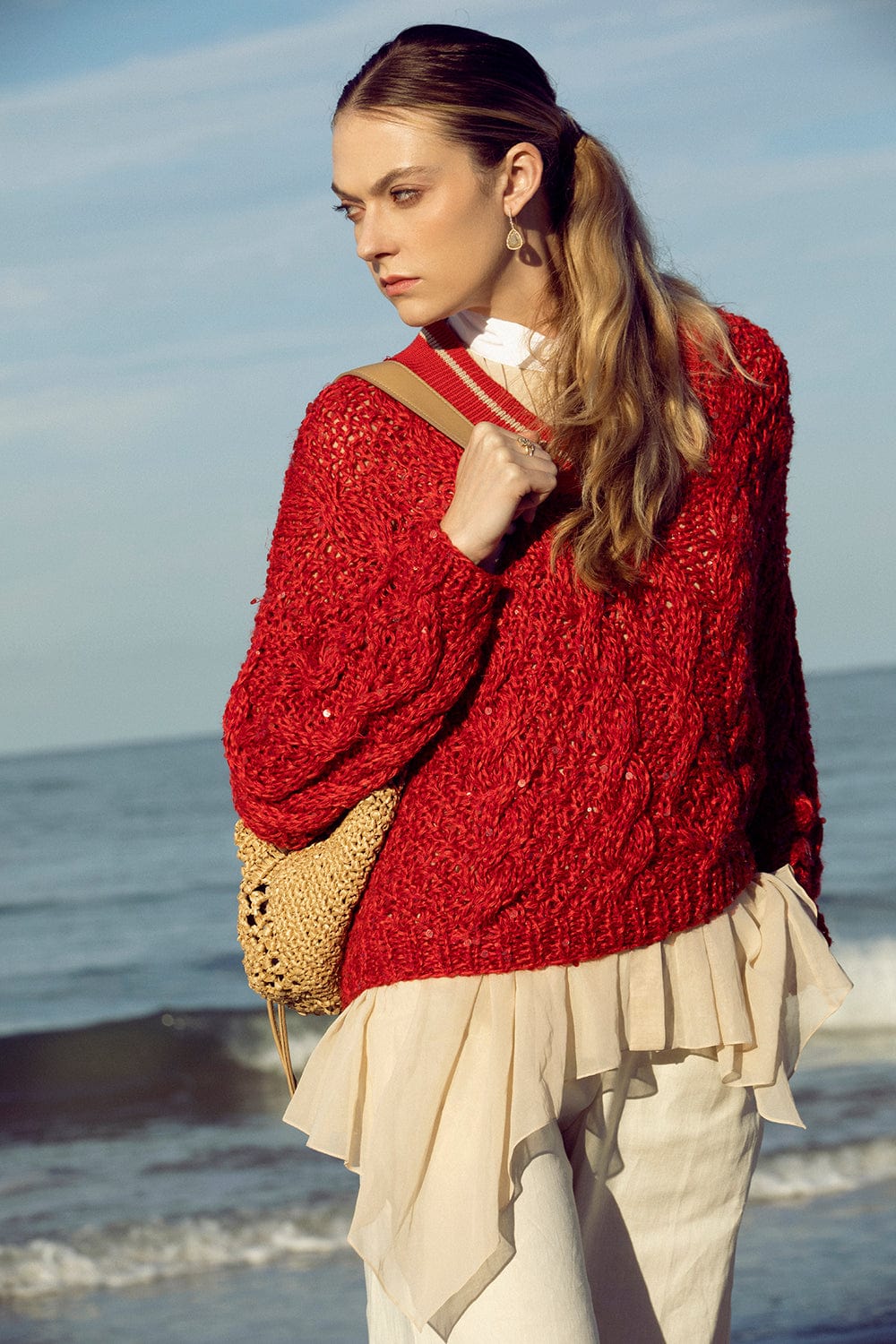 Brunello Cucinelli cable paillette opera knit in red chili.