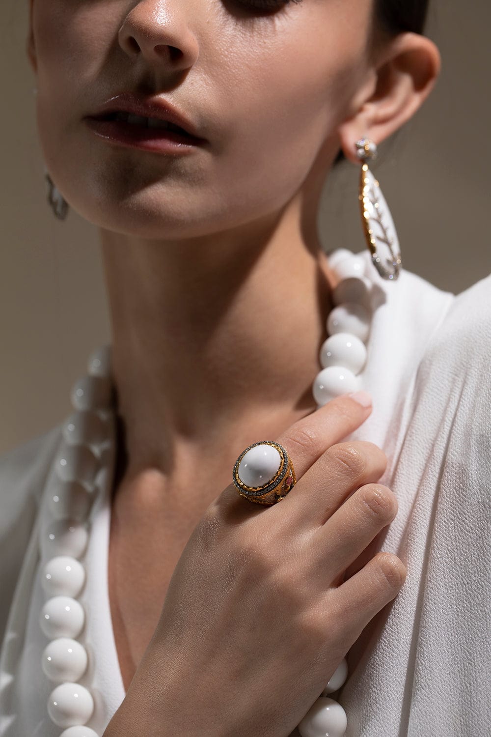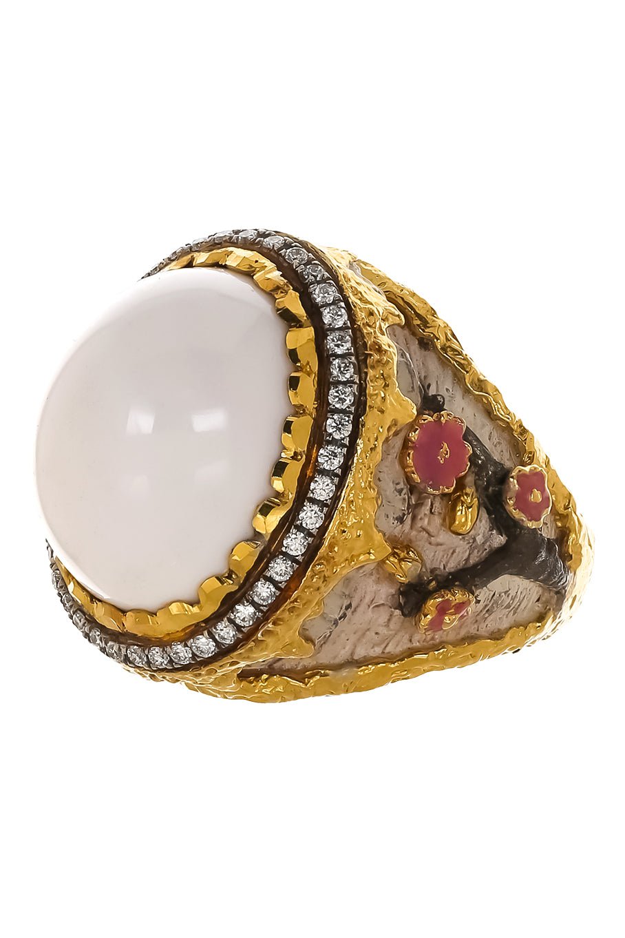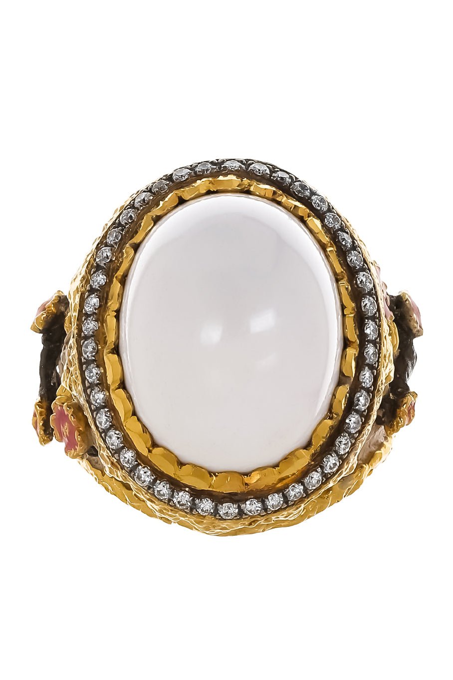 Victor Veylan cacholong diamond blossom ring in yellow gold.