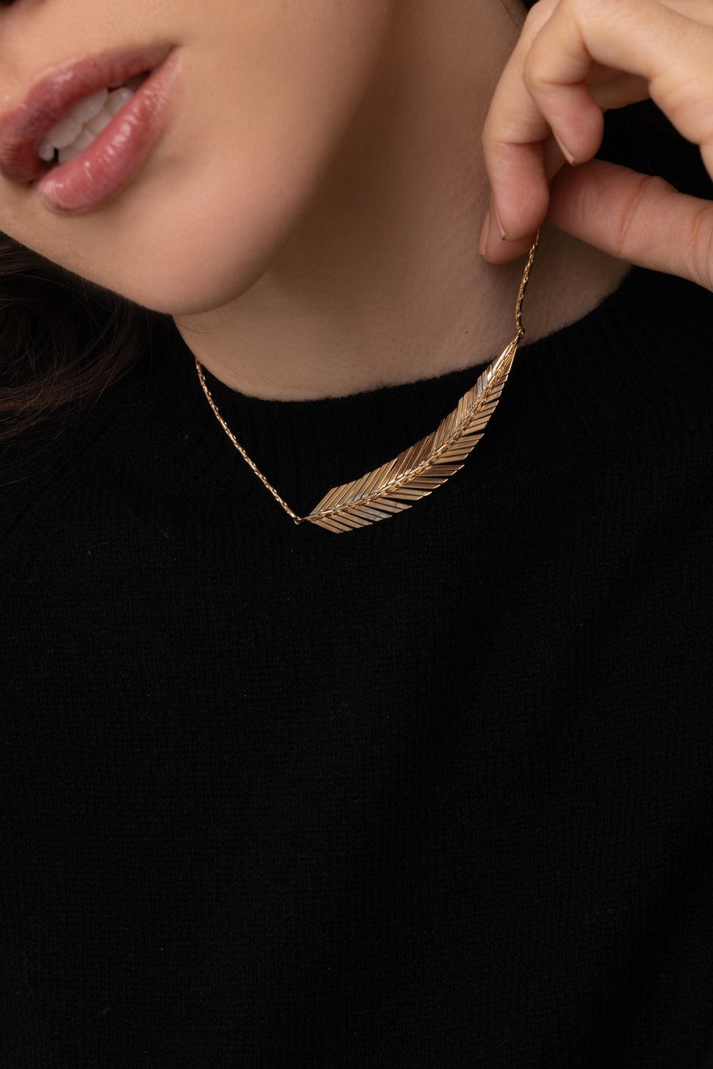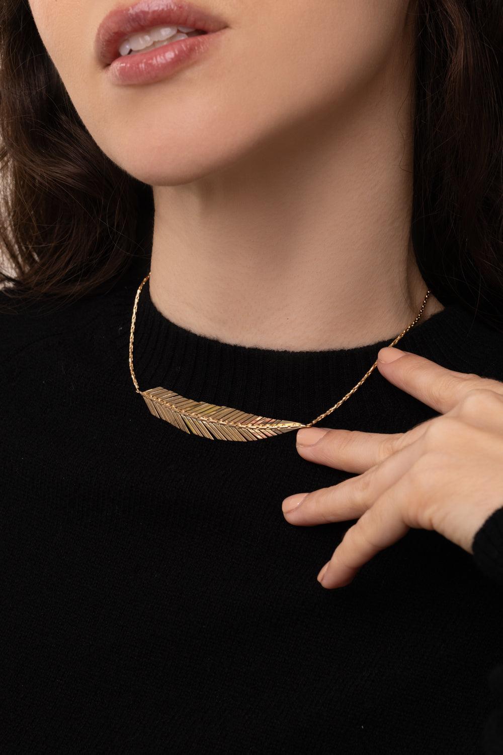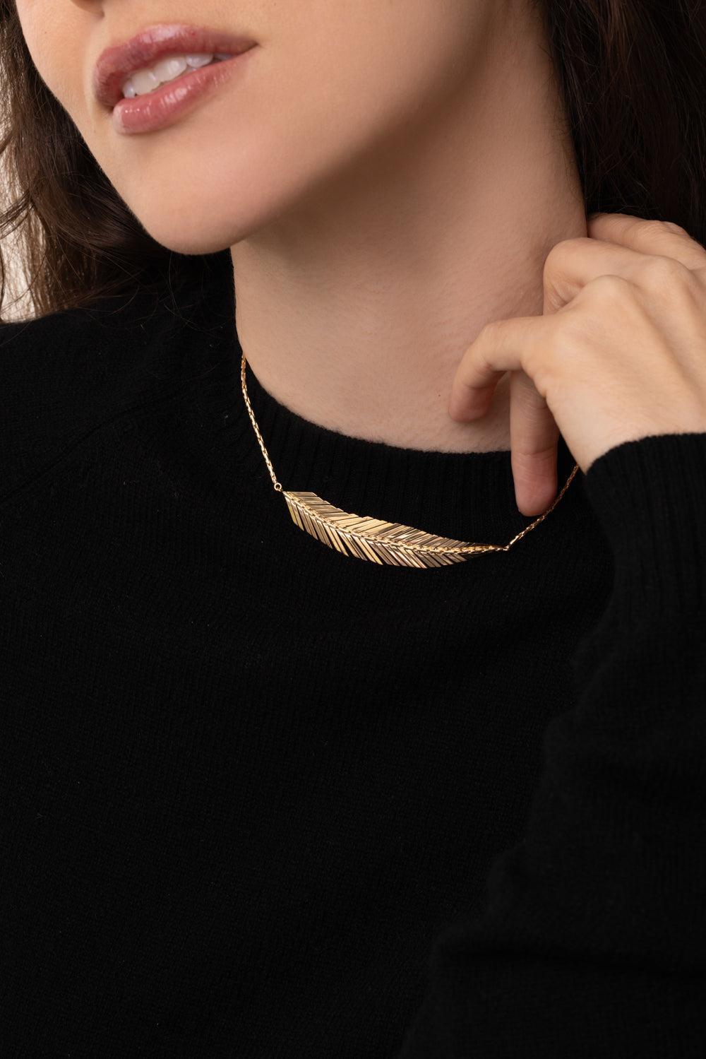 A clean and geometric gold feather necklace that drapes elegantly around your neck to form a light and dynamic statement. The center pendant is made up of individual sheets of enchanting 18K yellow gold, allowing each piece of the feather to move along with your body, reflecting sunlight from each immaculately polished surface. The clasp features an extension chord so you can adjust the length for a comfortable fit.