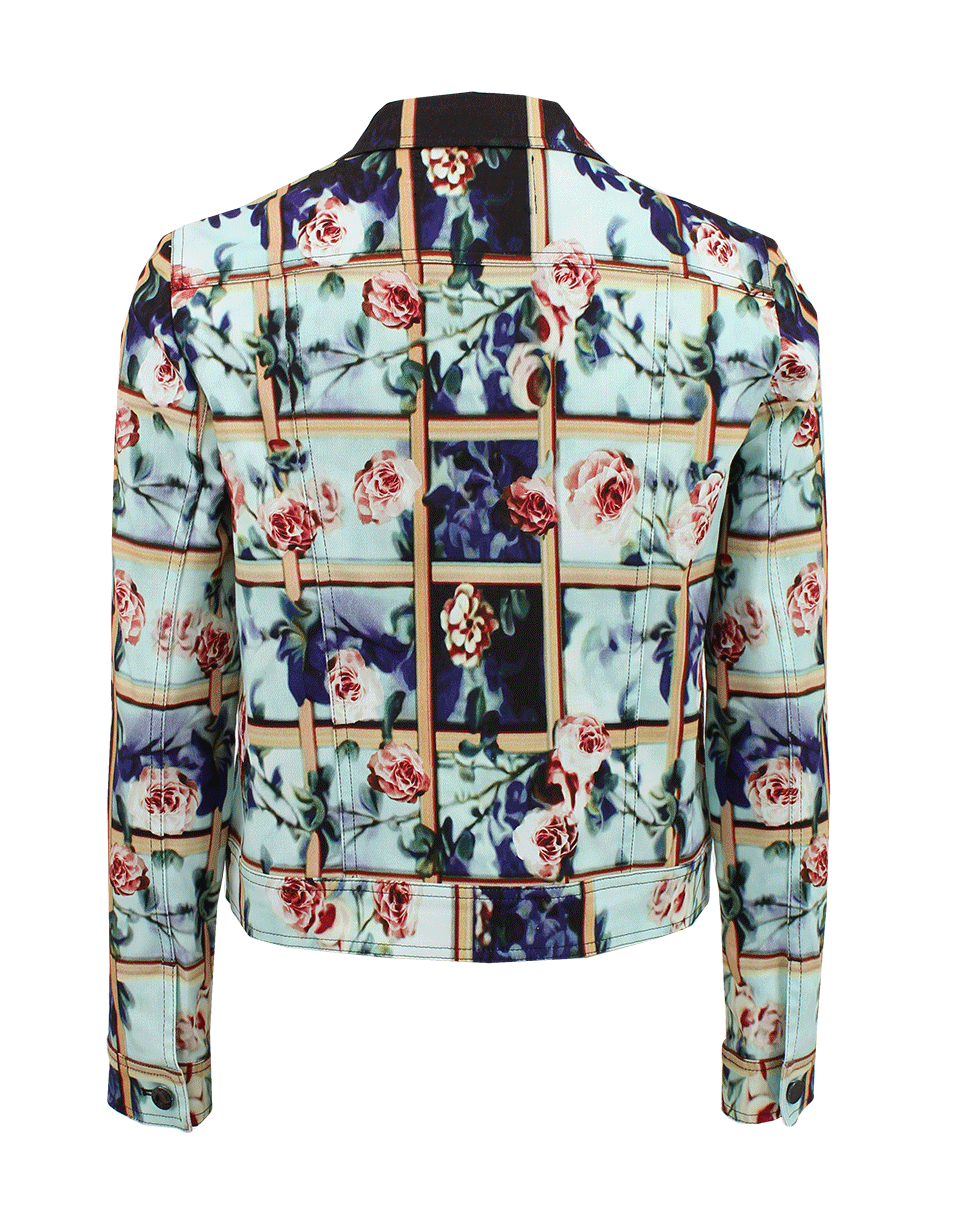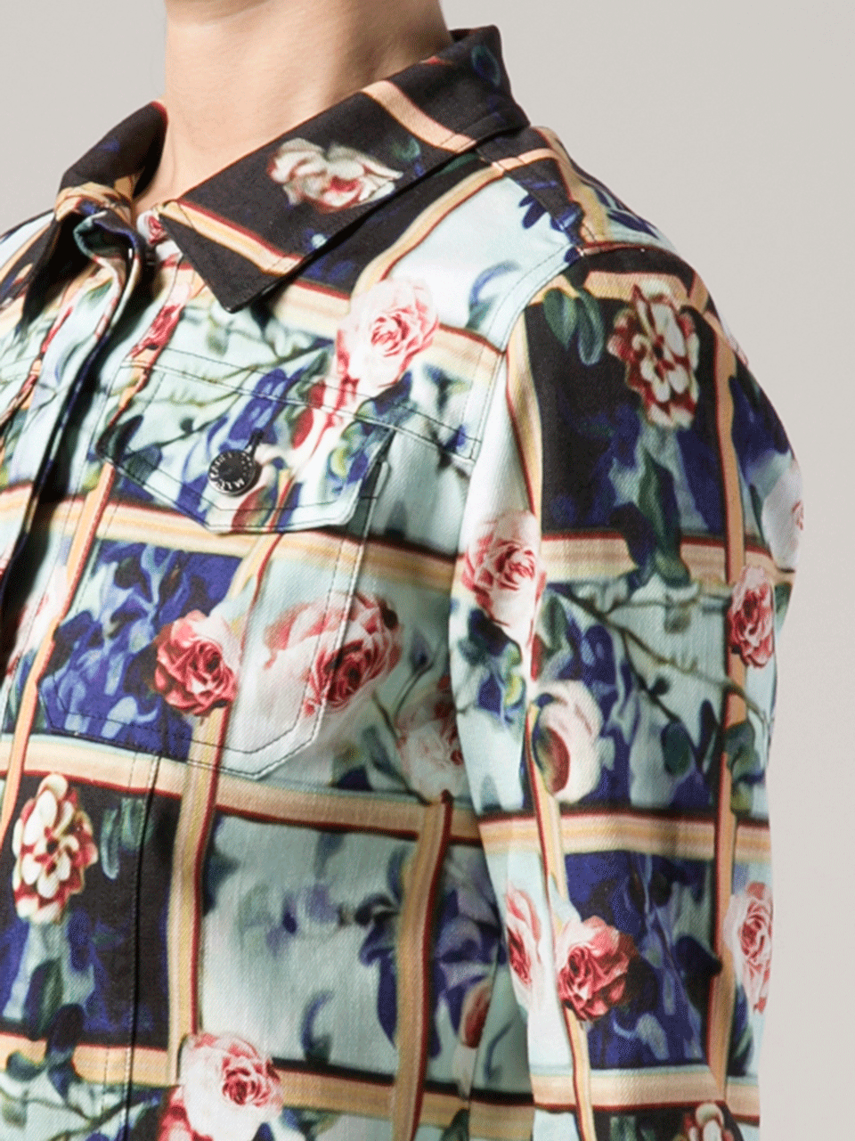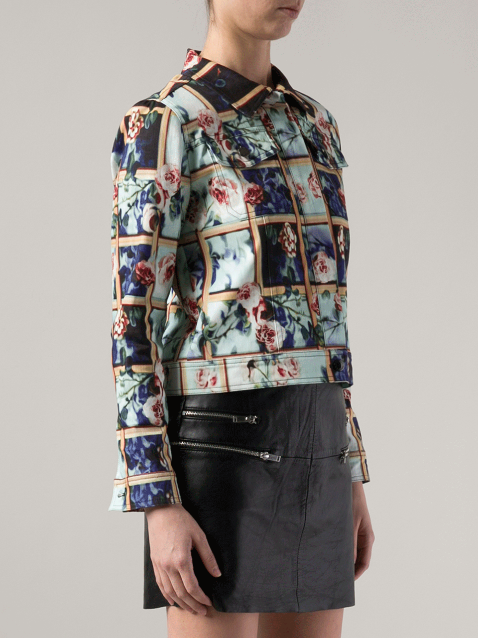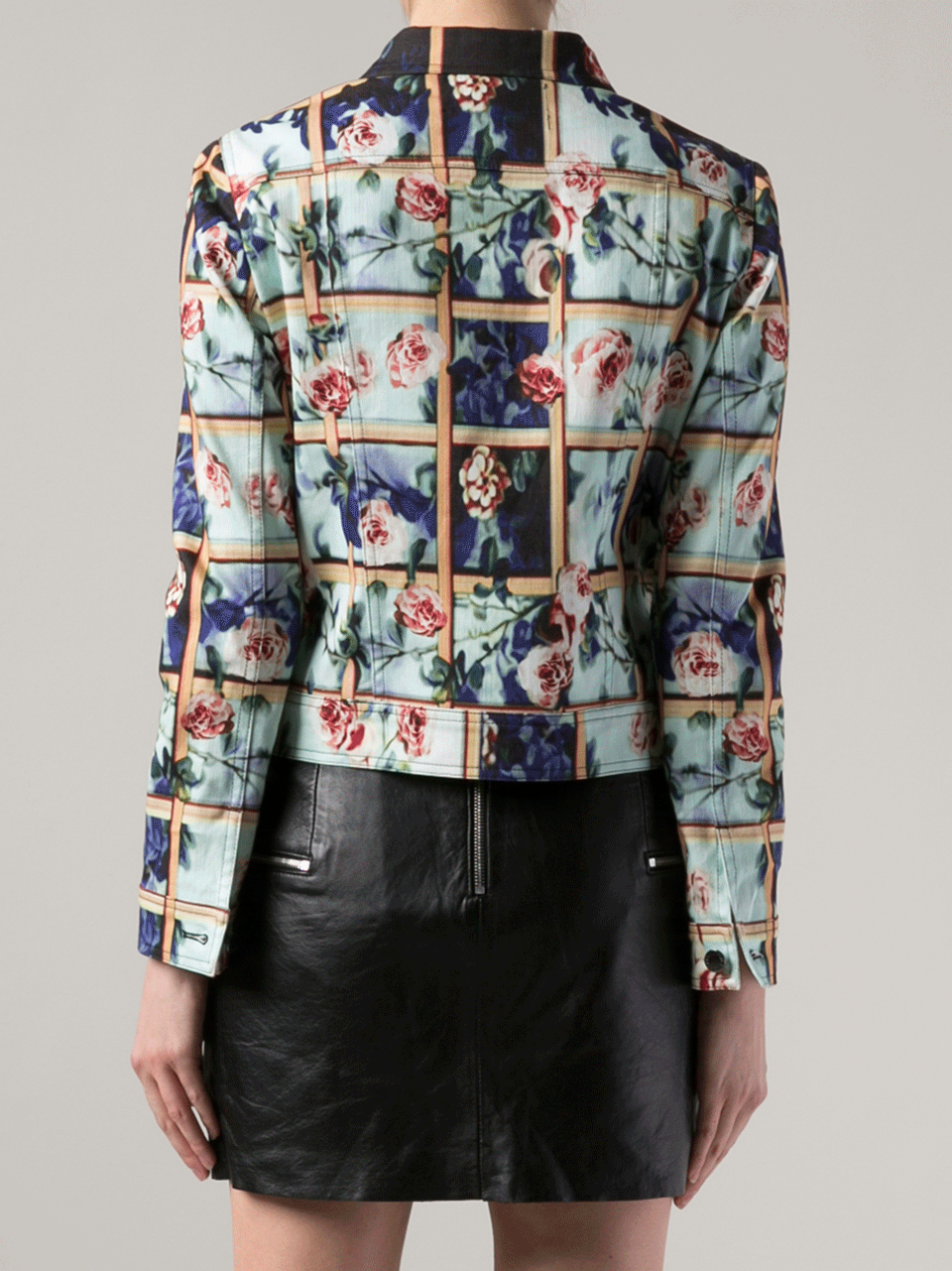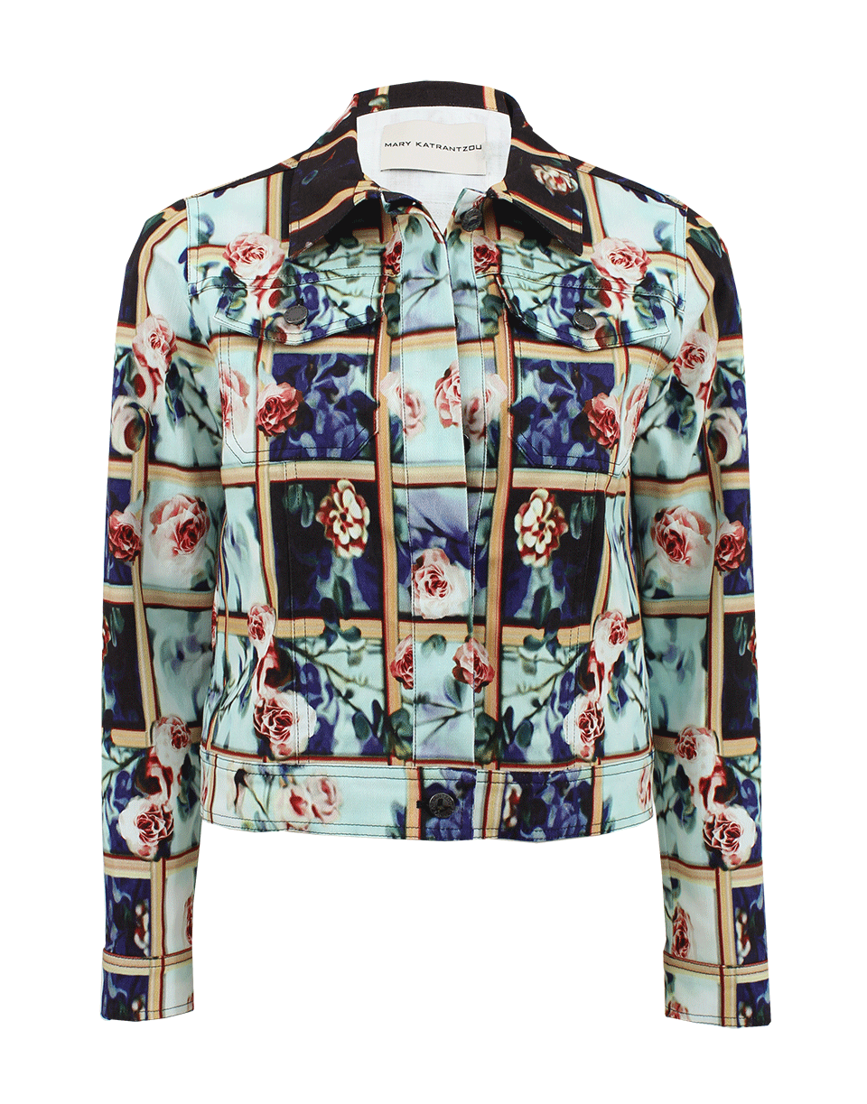 Combining beautiful blossoms with geometric patterns, Mary Katrantzou's cage floral print denim jacket is alluring.