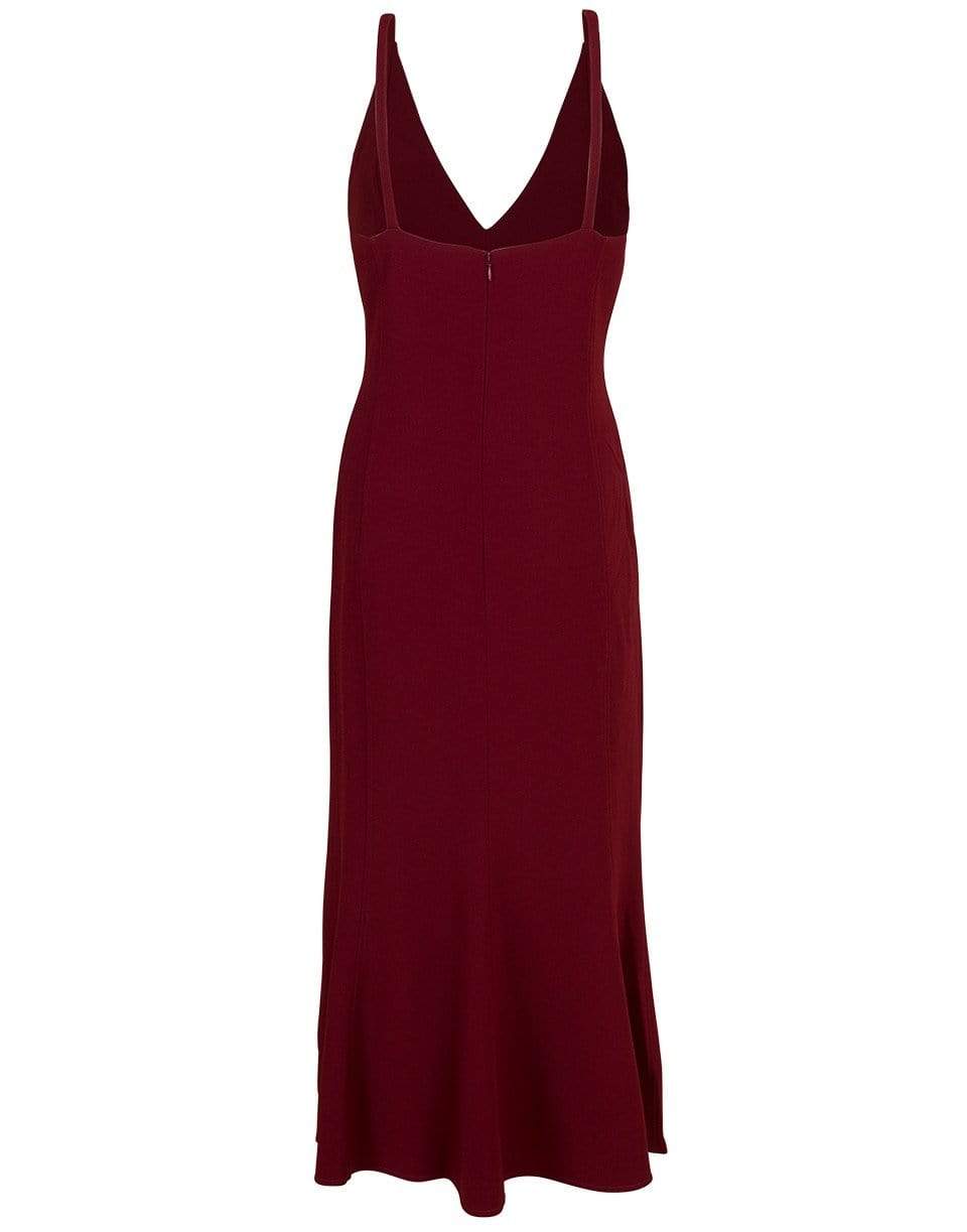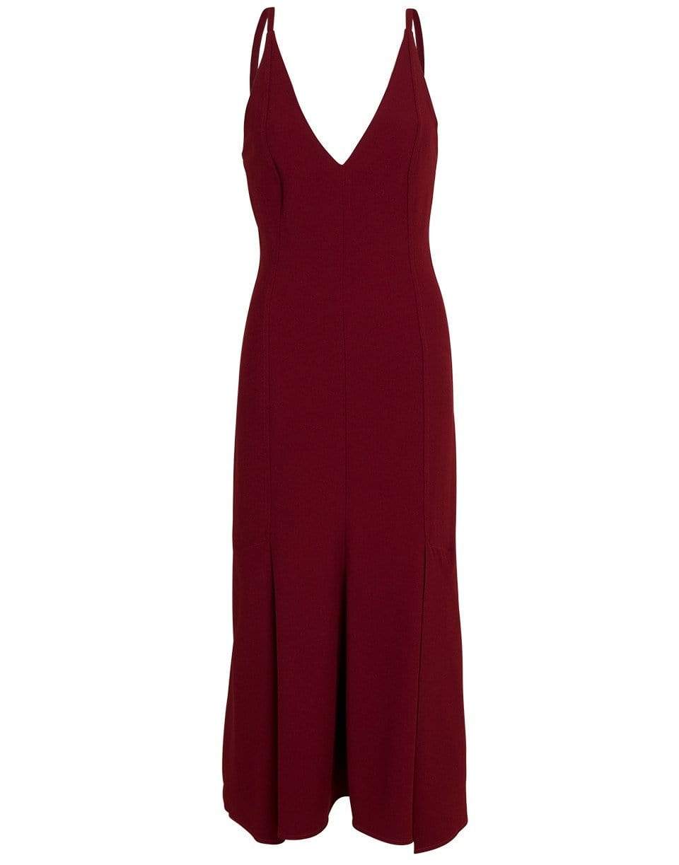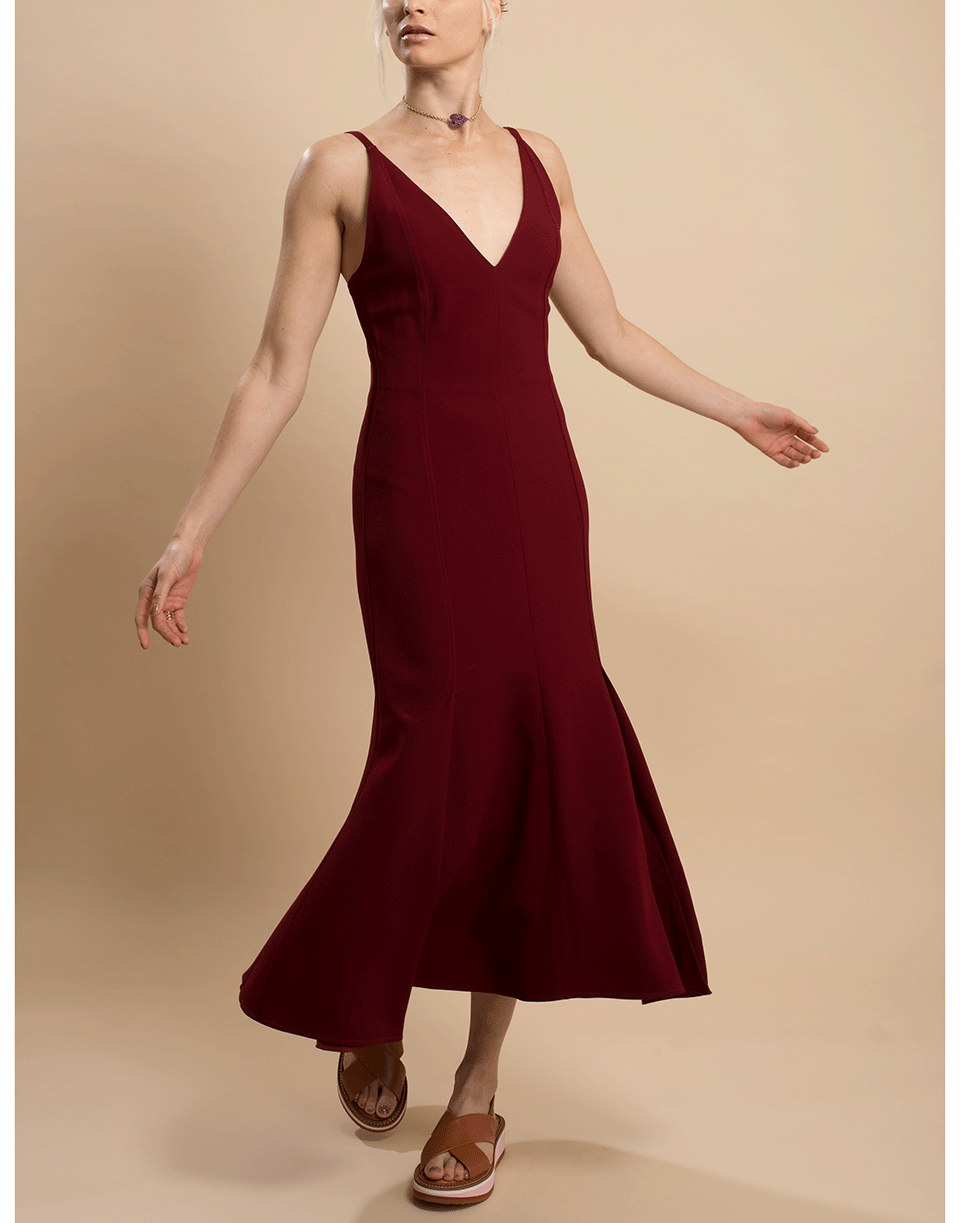 Victoria Beckham cami flare dress in Bordeaux with a slim fit, plunging V-neck, concealed zip closure, pleats at hem, and a mid-length.