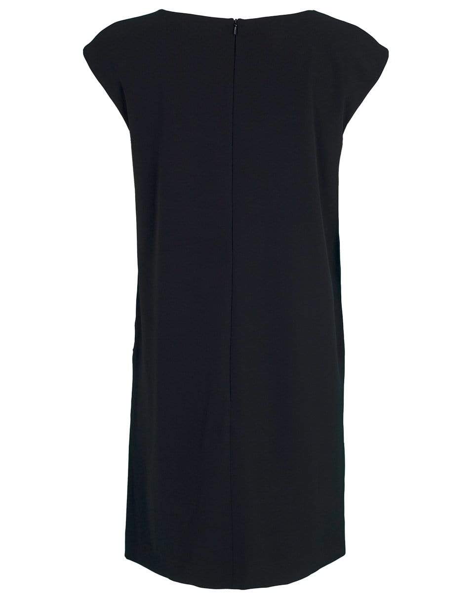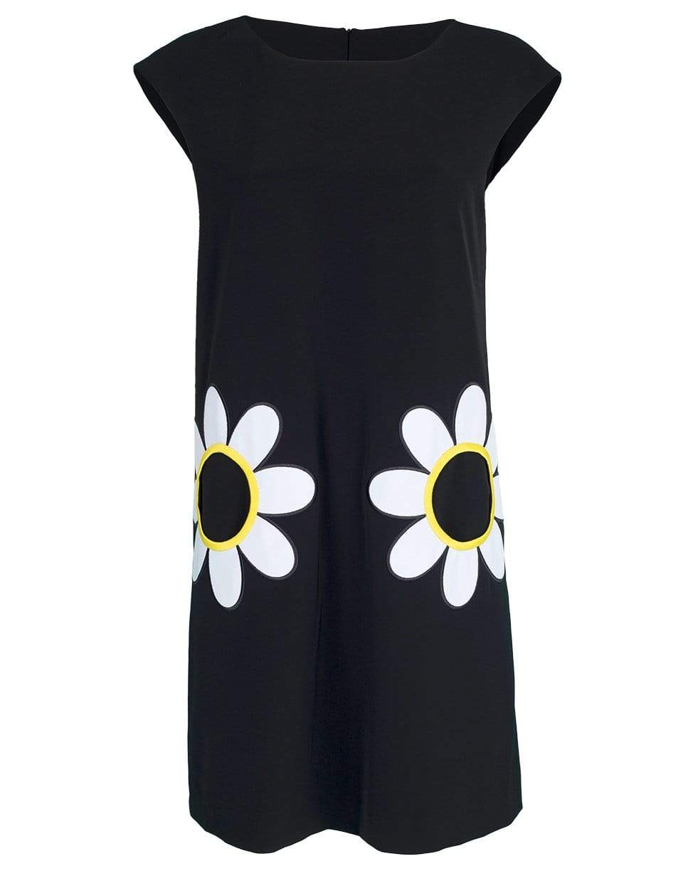 Boutique Moschino cap sleeve shift dress with daisy pockets, a round neck, concealed zip closure at back, and a short length.