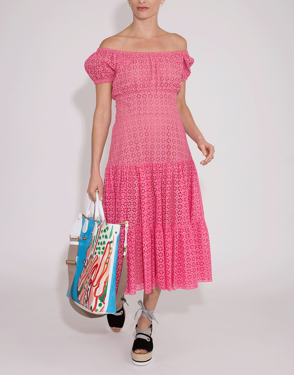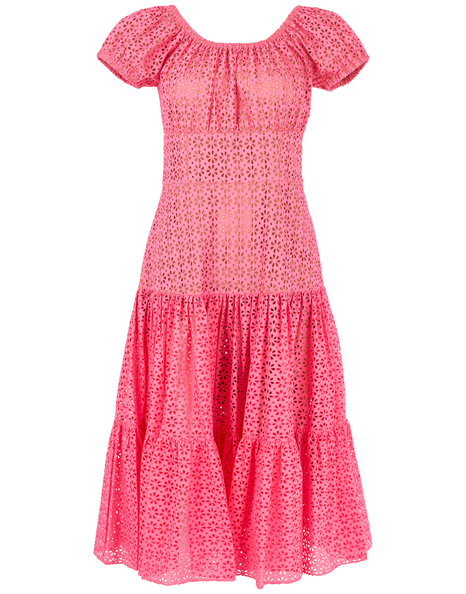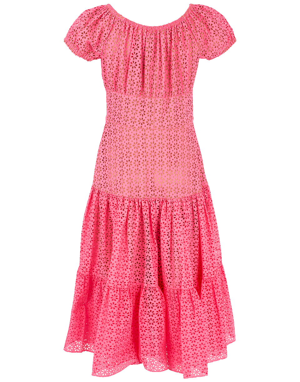 This pink cotton Michael Kors dress features a midi length, floral-eyelet embroidered pattern throughout, a round neckline, cap puff sleeves and a tiered A-line silhouette.