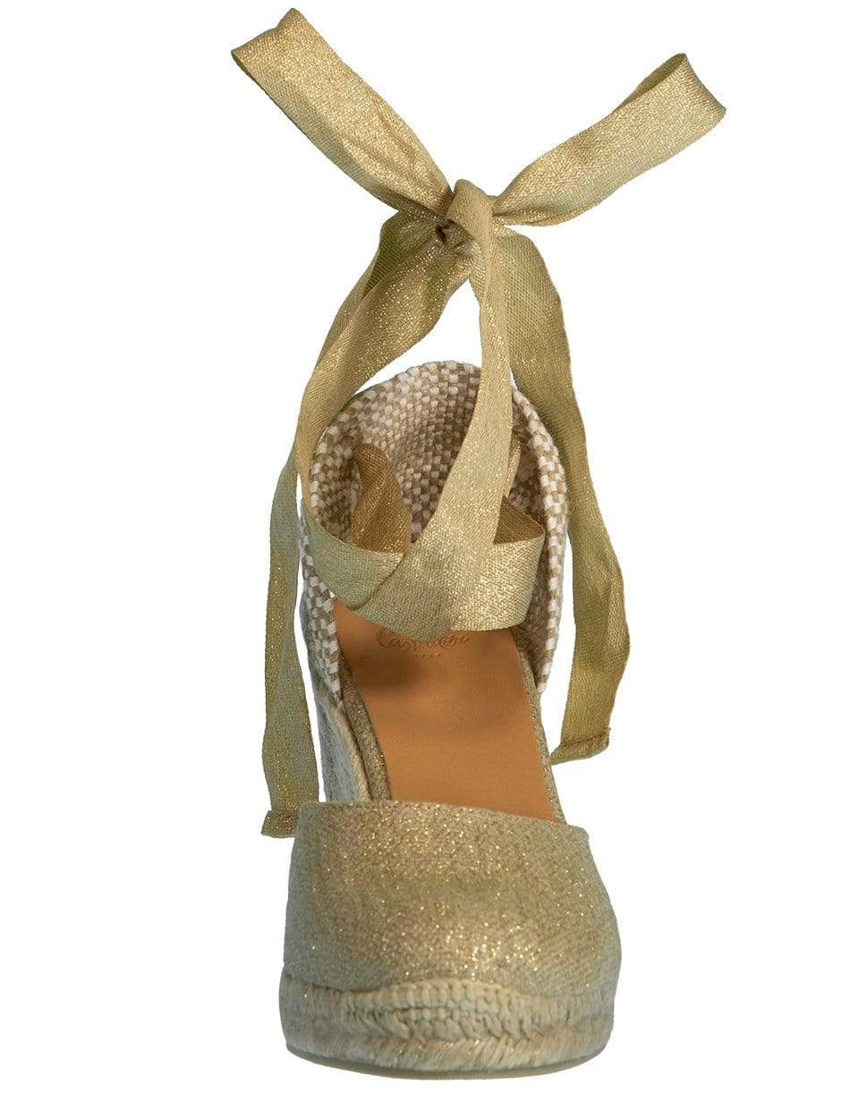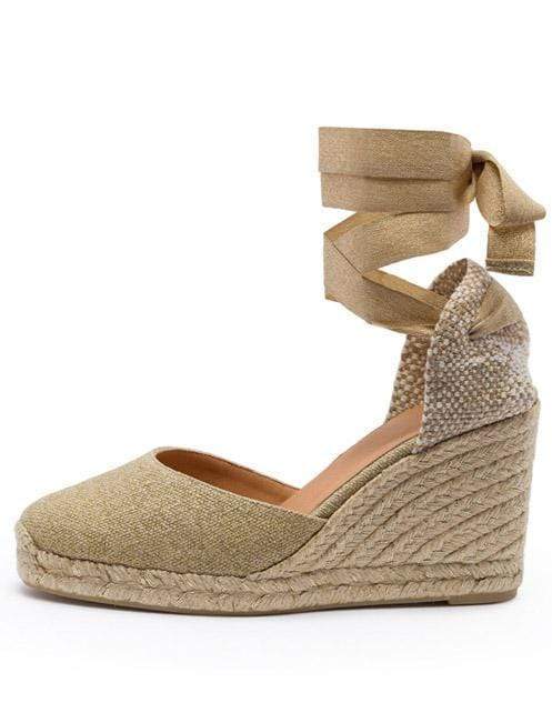 Castaner Carina lace up canvas and natural jute espadrilles with a round toe, 80mm wedge heel, ankle ribbon ties, leather lining, cotton insole and rubber sole.