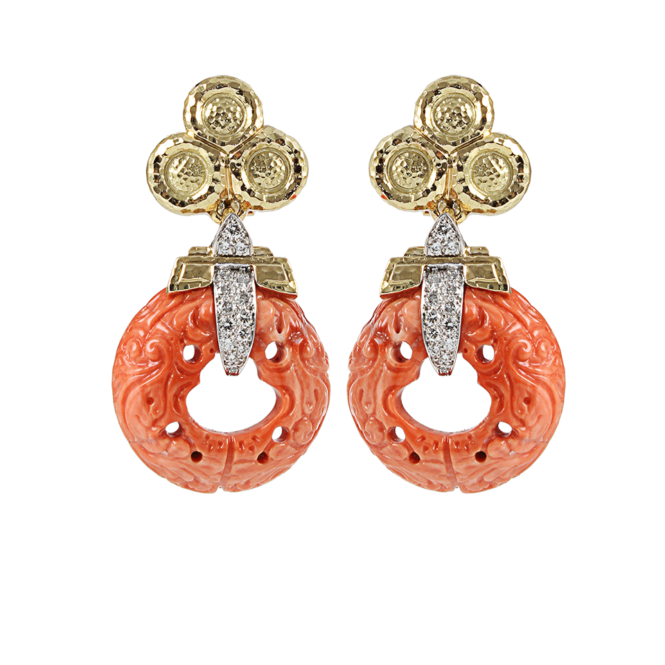 These whimsical carved coral and diamond earrings by David Webb are undeniably captivating. Pair them with a flowing maxi dress and other golden pieces to accent.
