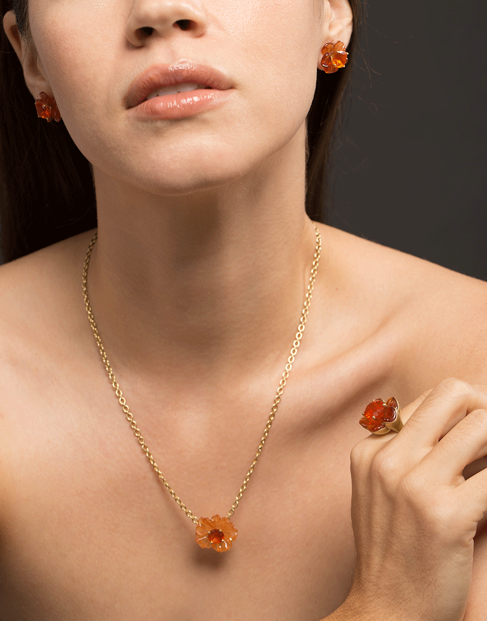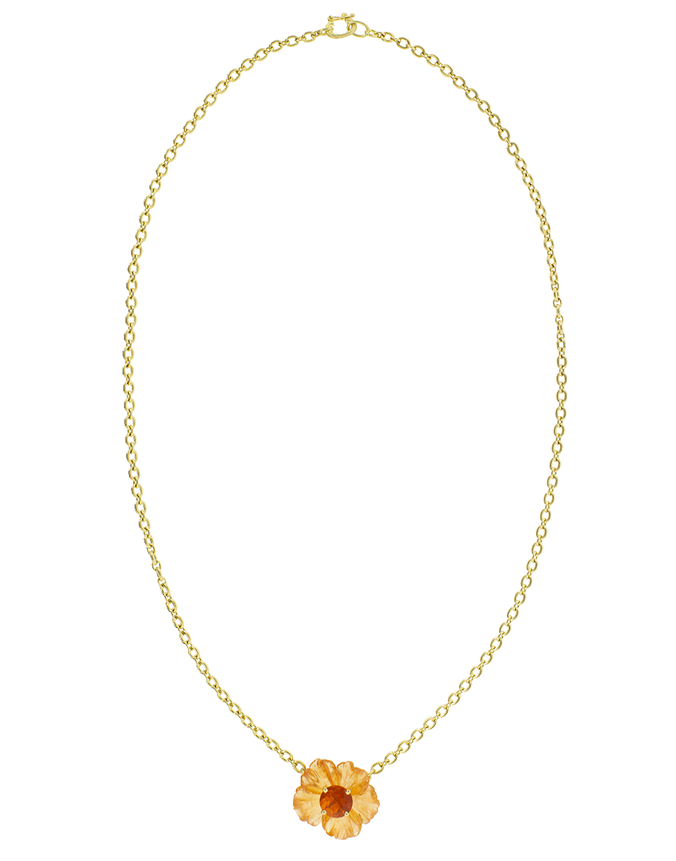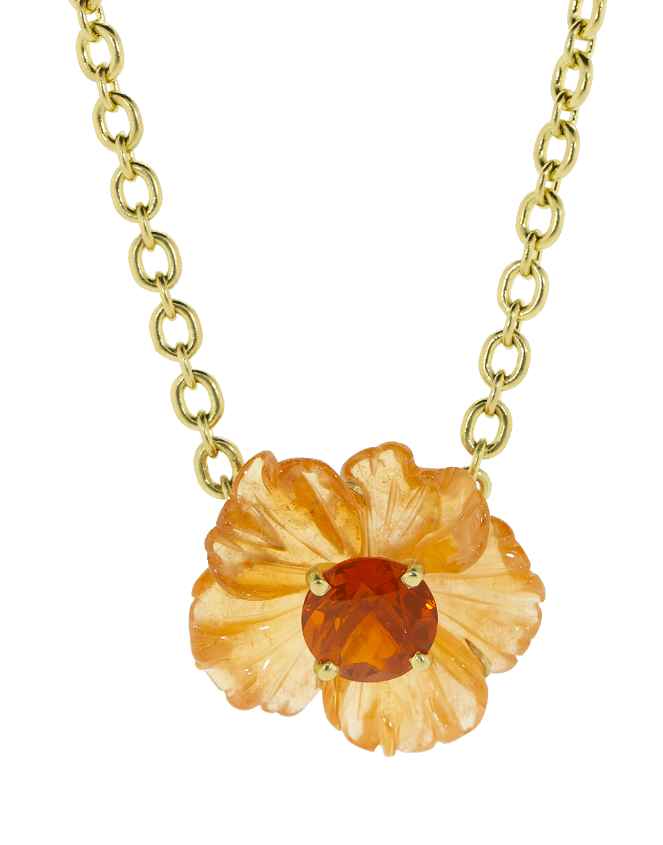This one-of-a-kind necklace features a fire opal center stone and carved mandarin garnet petals. The necklace is 18" length with a hinge clasp closure for a secure fit.