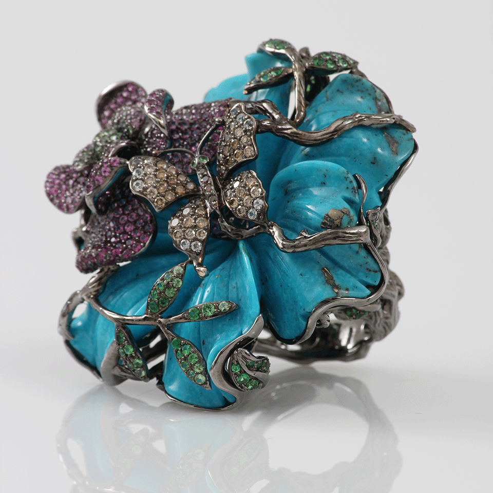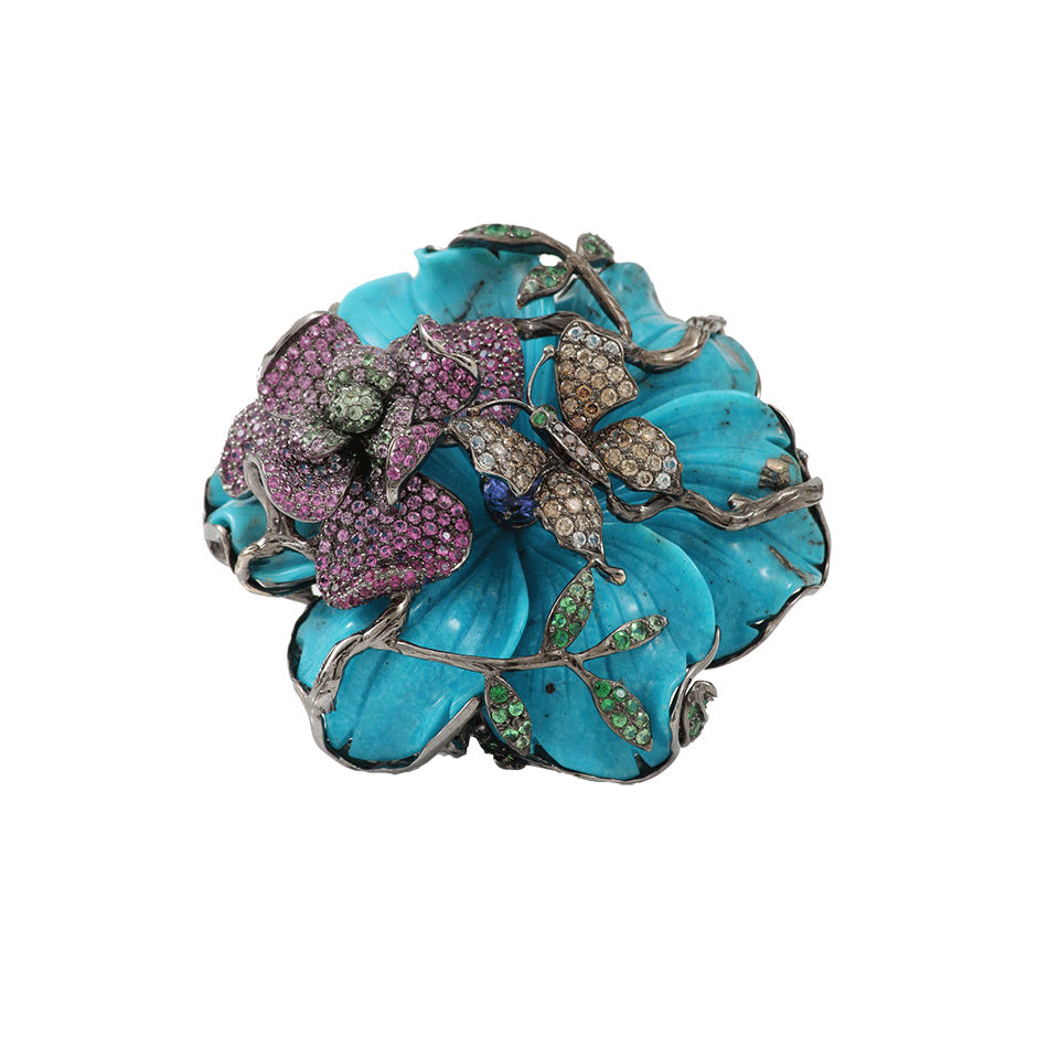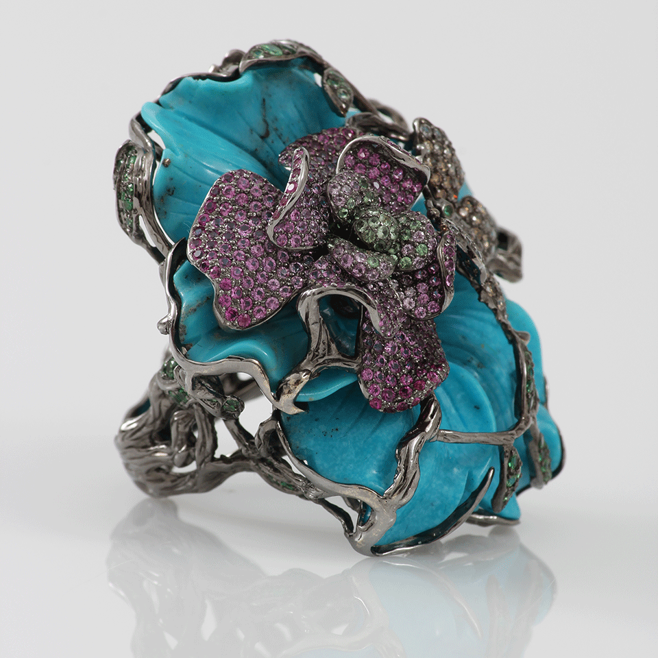 Carved Turquoise Flower Ring With Pink And White Sapphire, Tsavorite Garnet, Tanzanite And Cognac Diamonds From Wendy Yue