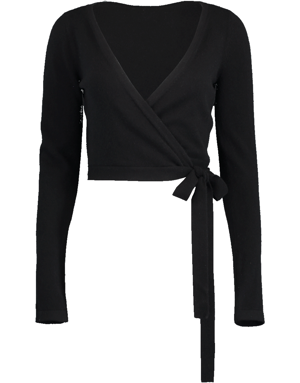 Black cashmere wrap top from Michael Kors featuring a fitted silhouette with a v-neck, long sleeves, and a tie fastening.