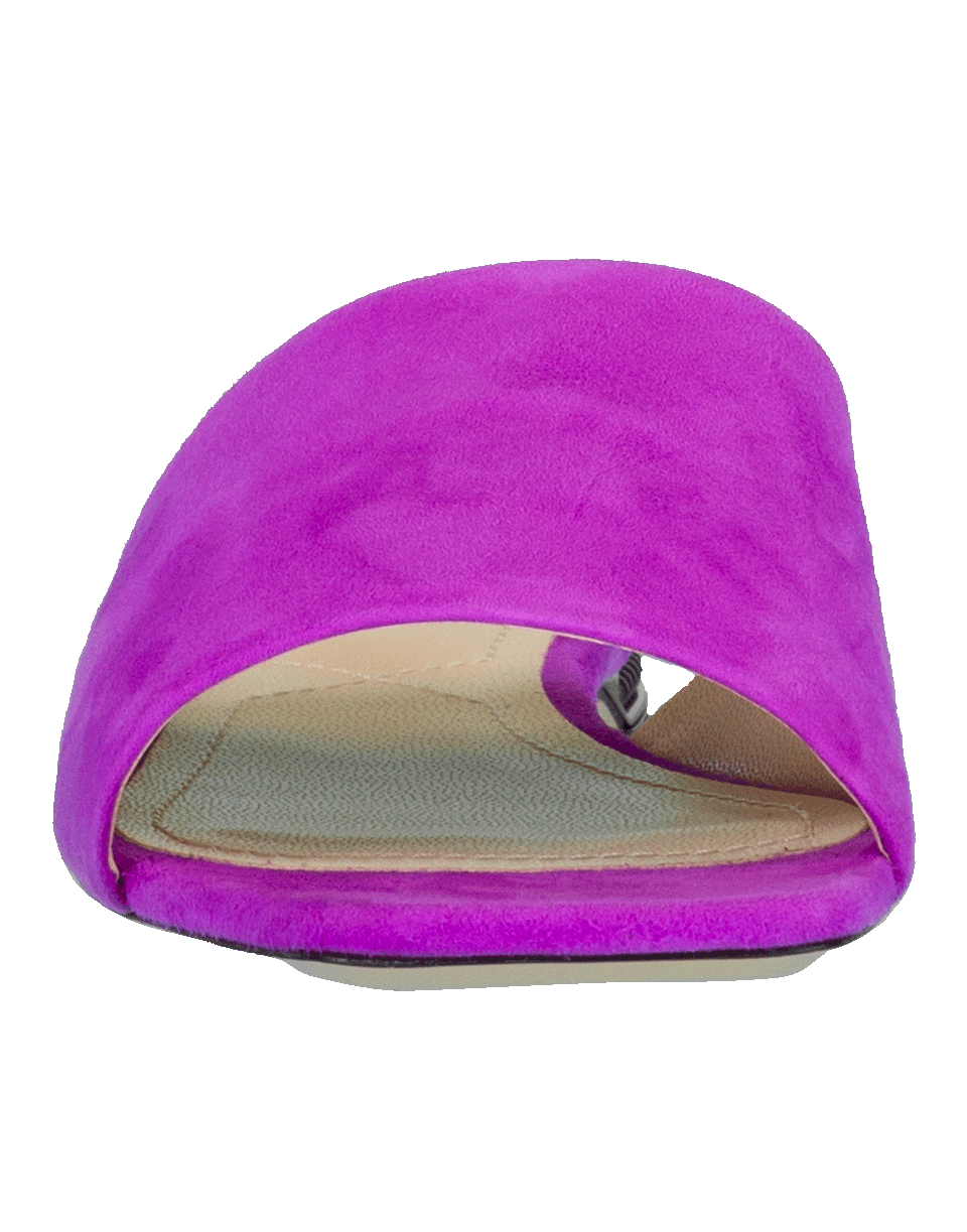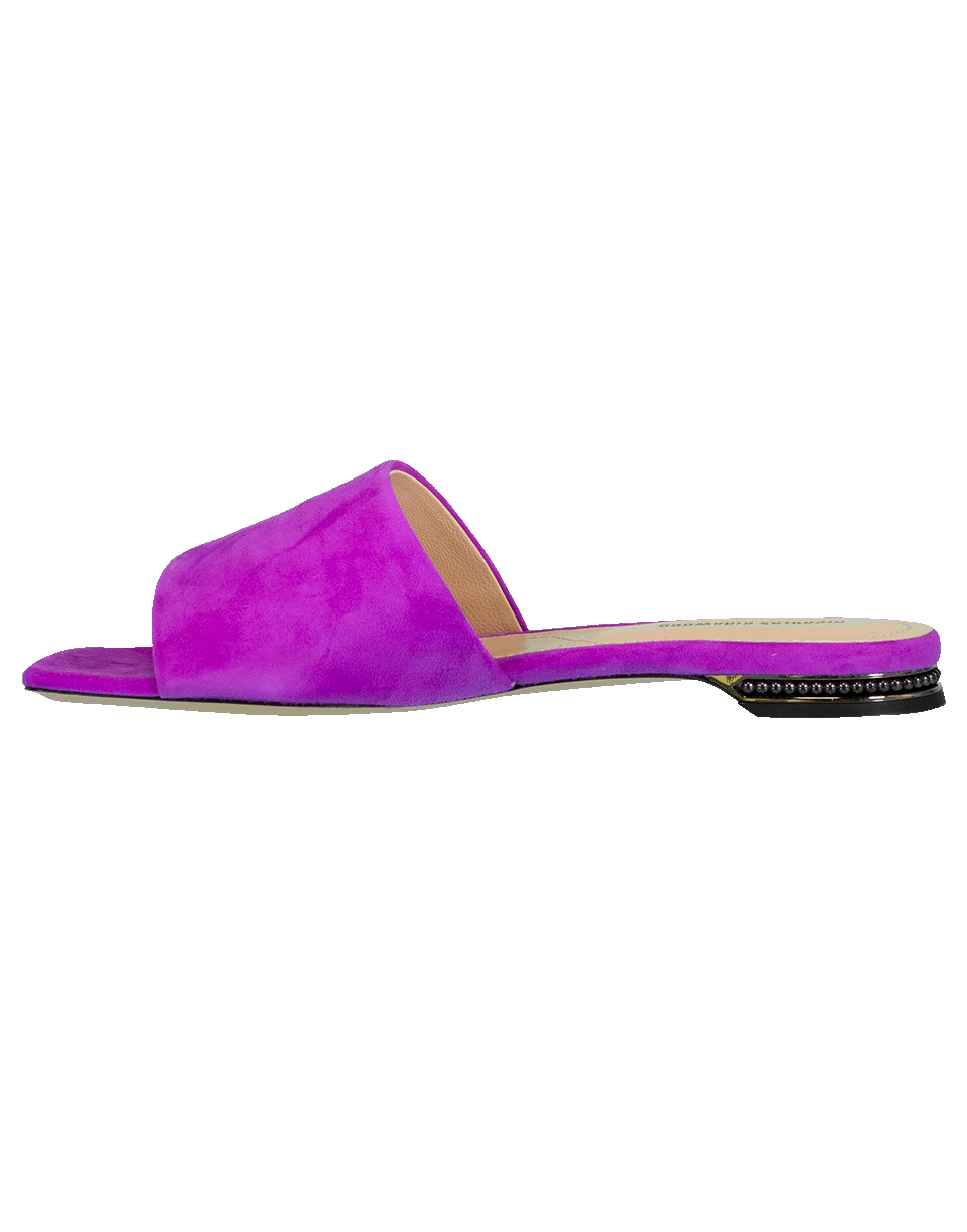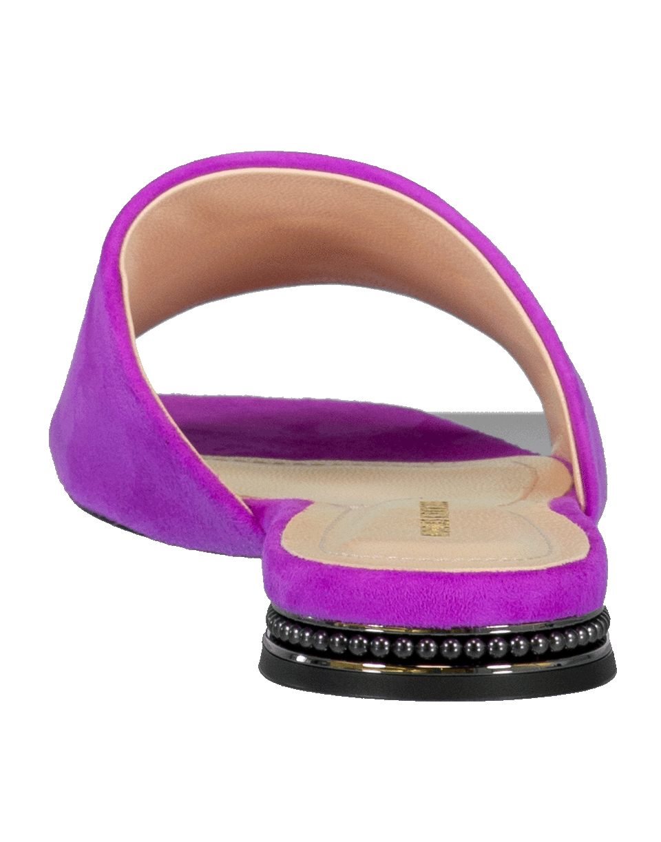 Magenta ‘Casati’ pearl slide by Nicholas Kirkwood. This leather slip-on sandal features an open square toe, tan leather lining and a row of tiny faux-pearls inset at low heel.