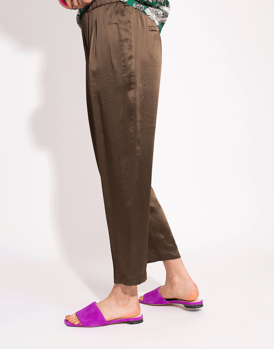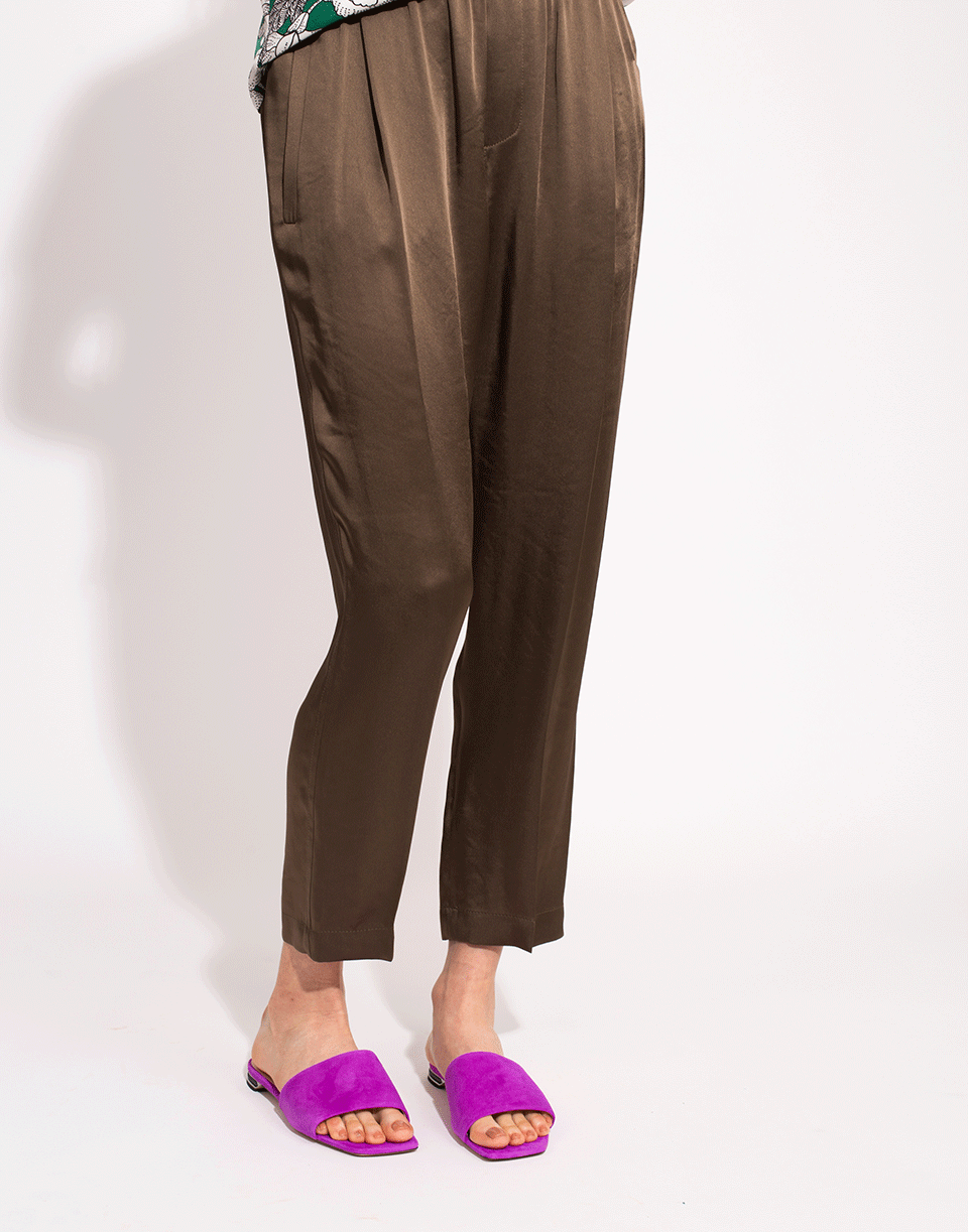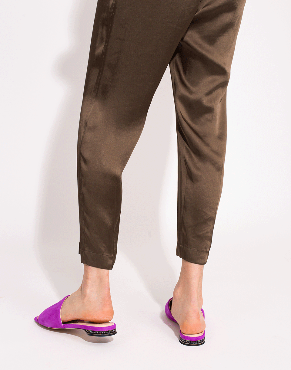 Magenta ‘Casati’ pearl slide by Nicholas Kirkwood. This leather slip-on sandal features an open square toe, tan leather lining and a row of tiny faux-pearls inset at low heel.