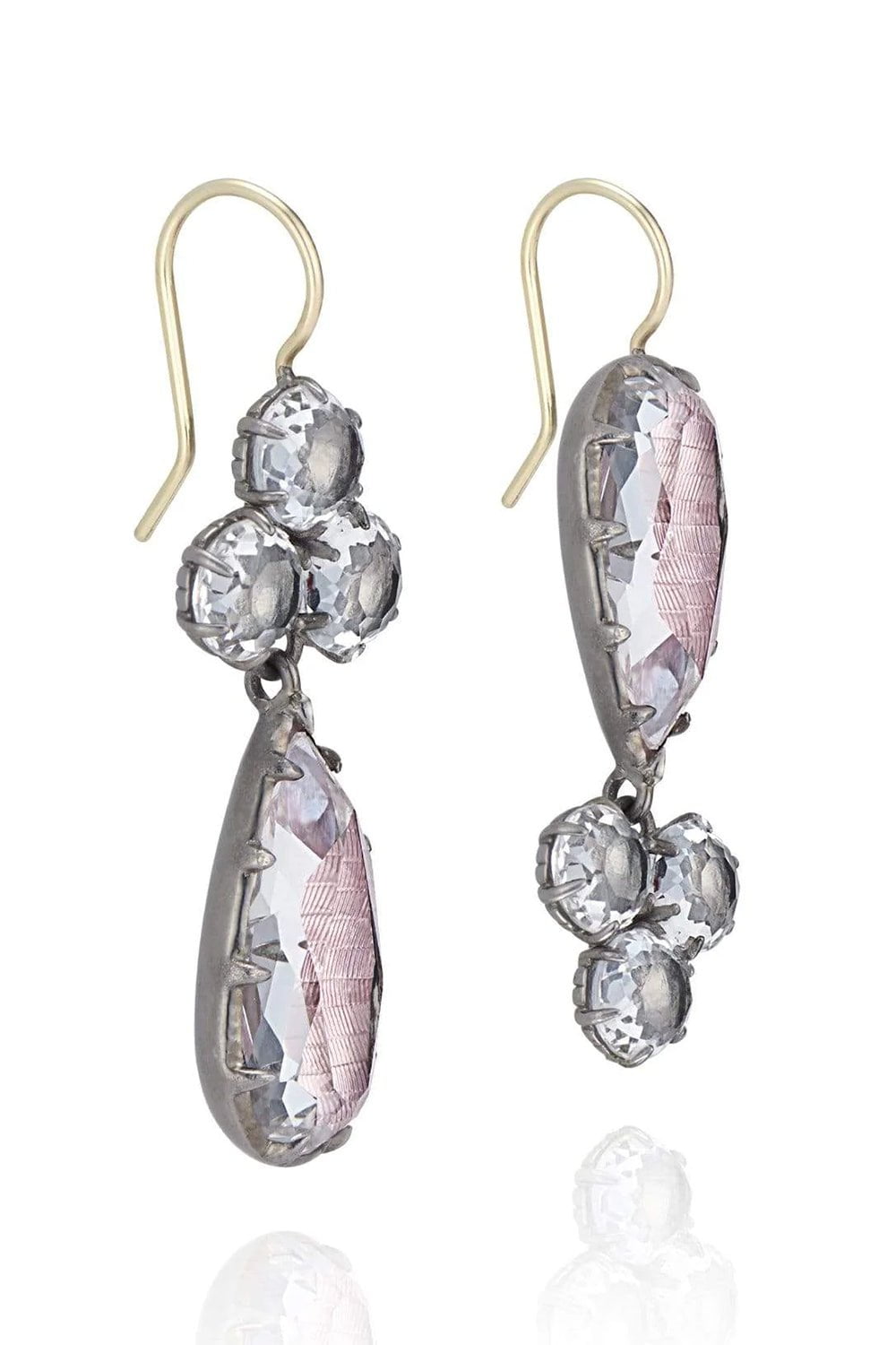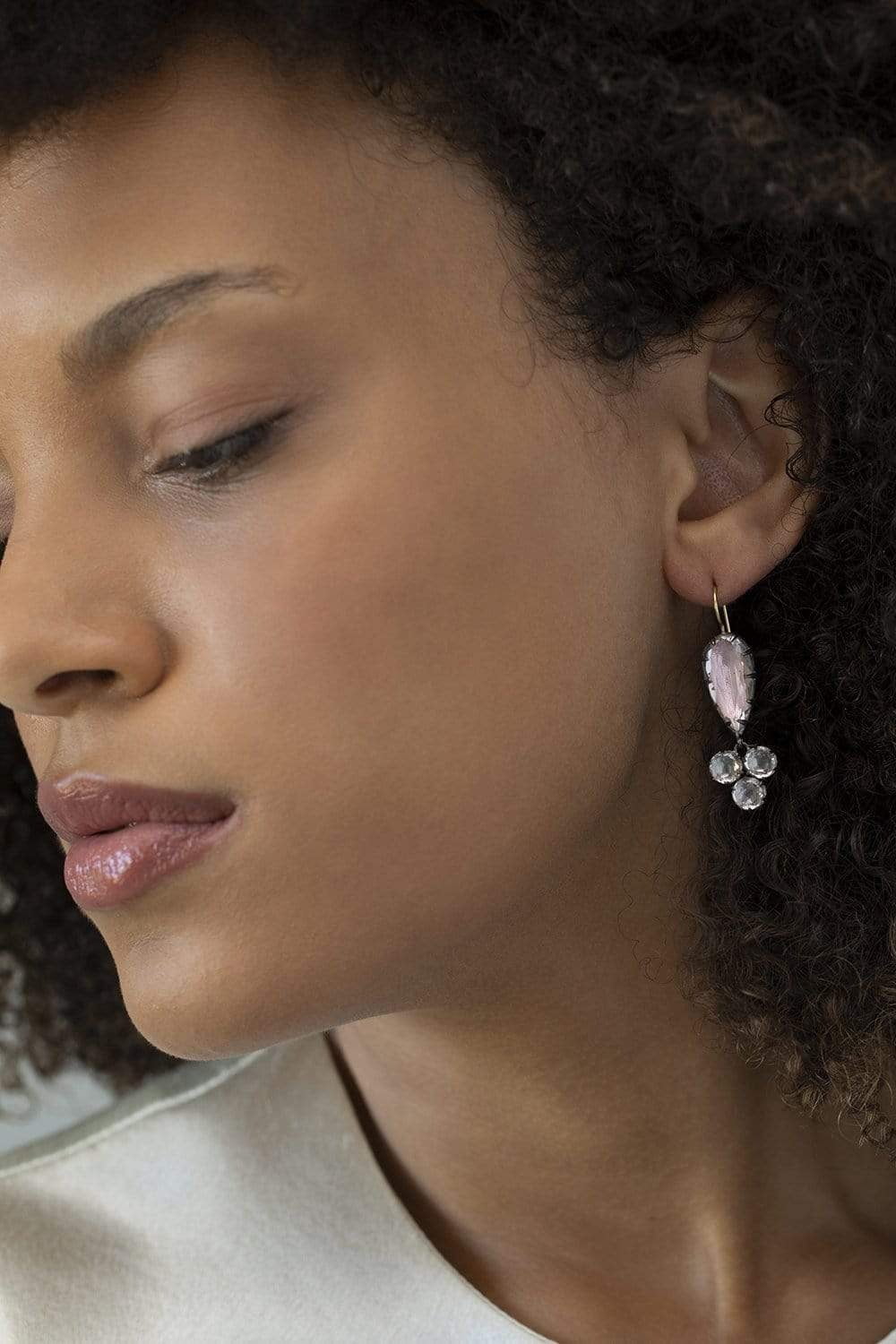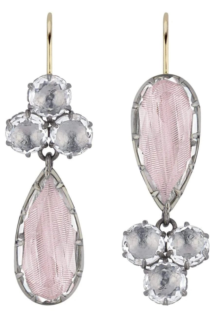 Black rhodium washed sterling silver and white quartz (18 ctw) with ballet and dove foils on 14K Yellow Gold earwire.