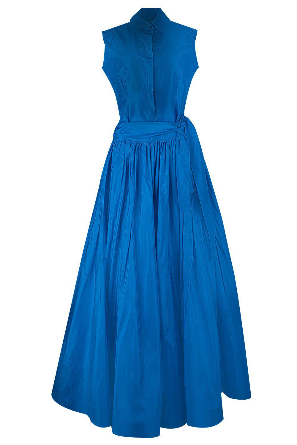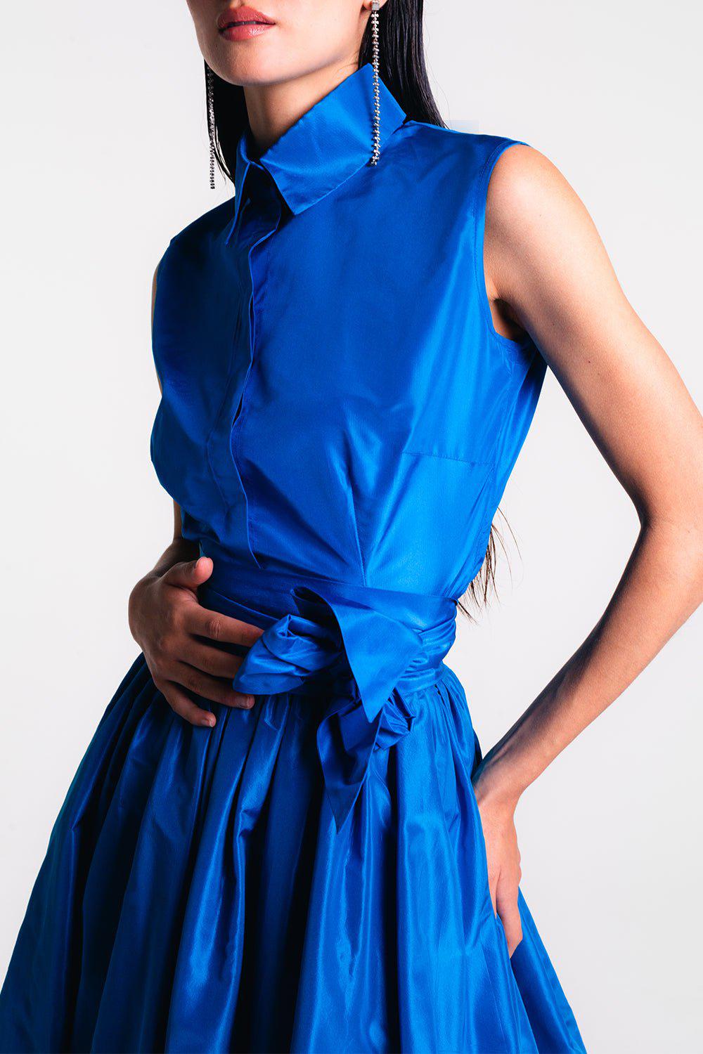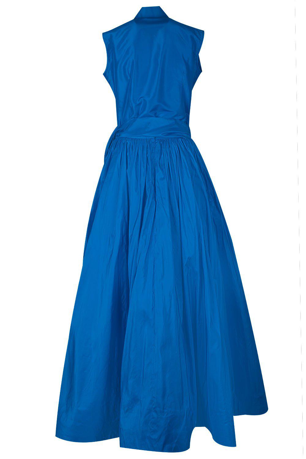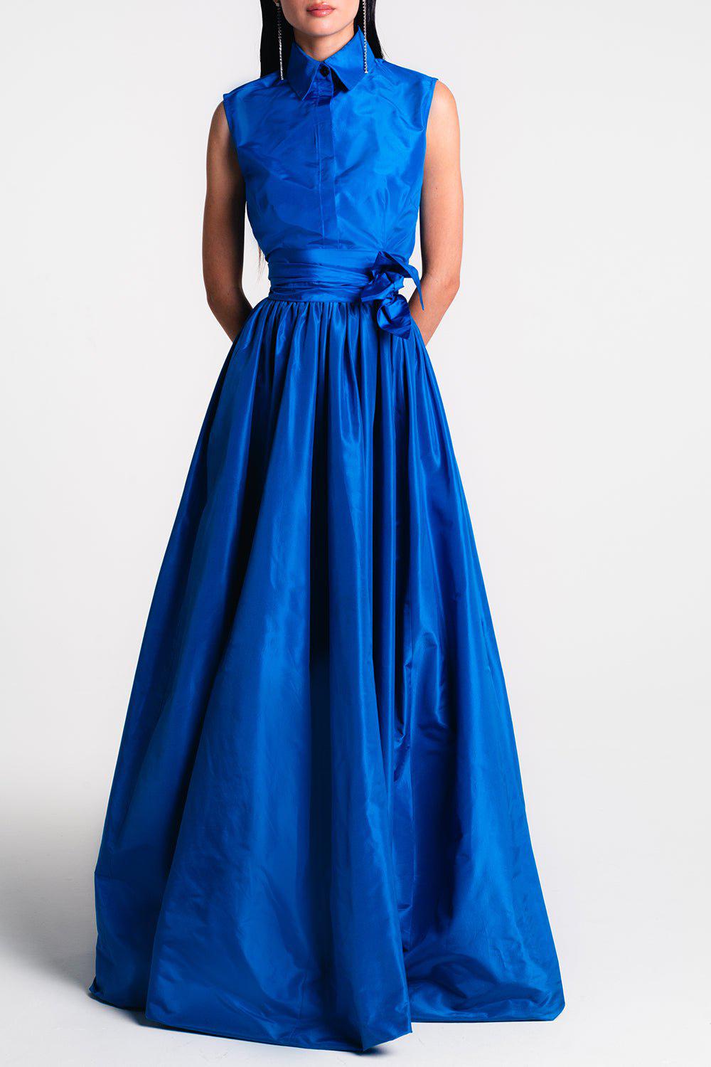 Catherine Regehr collared shirt ballgown skirt set in ocean blue.