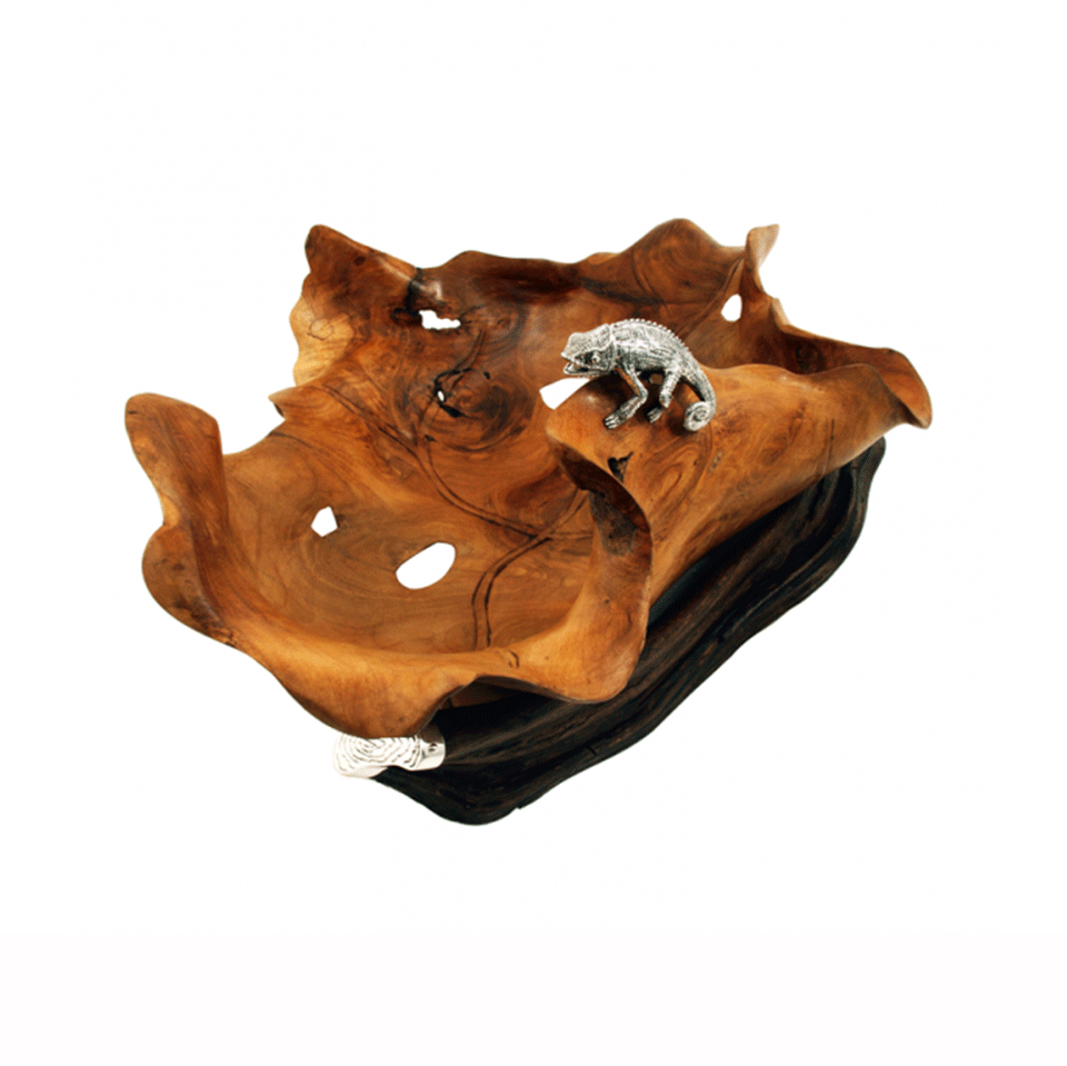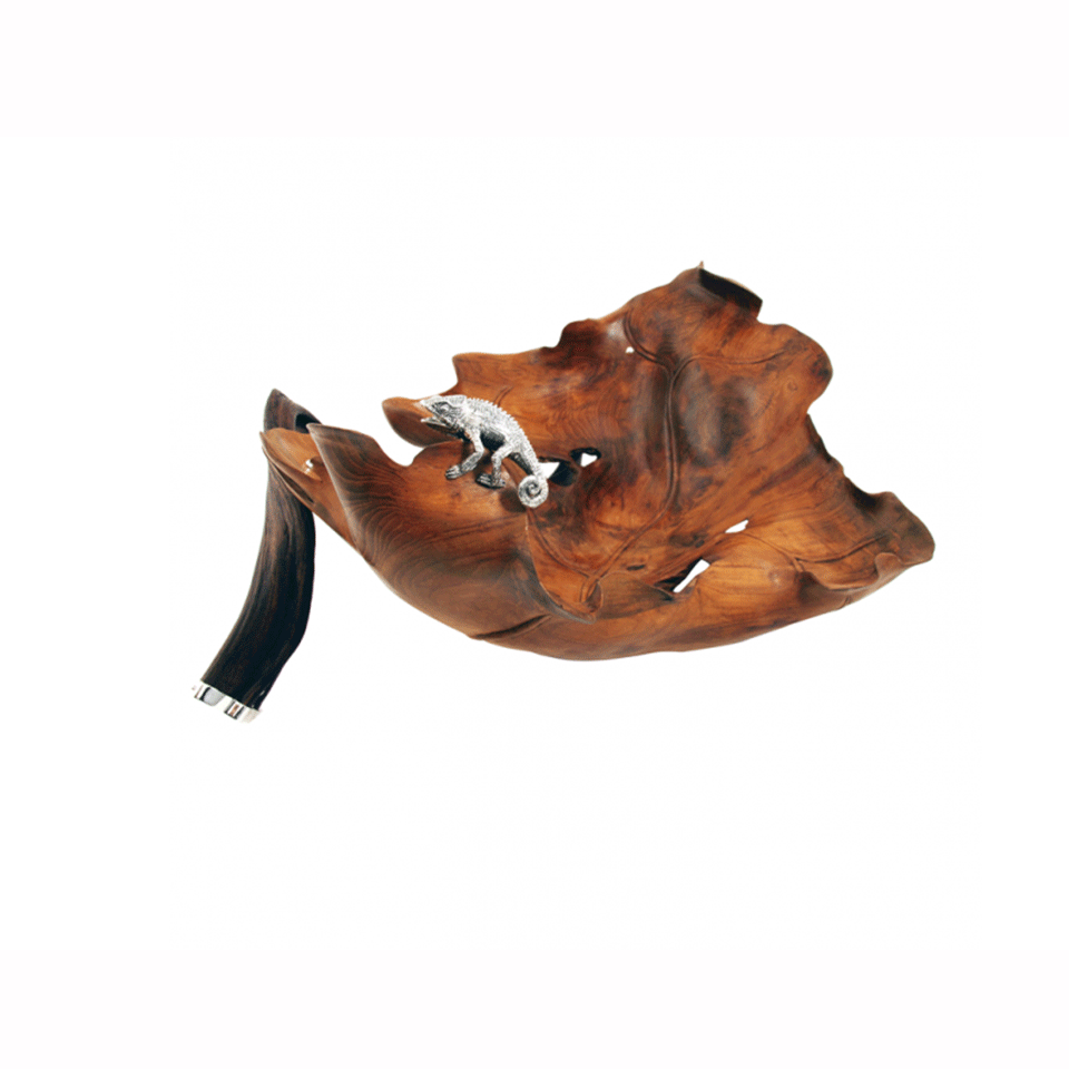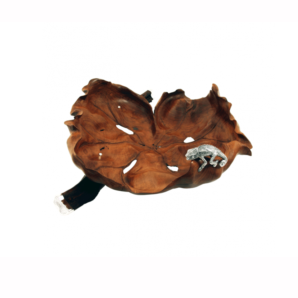 Carved from one single piece of teak root, this lotus leaf bowl is adorned with Sterling silver chameleon and liana wood to act as base.