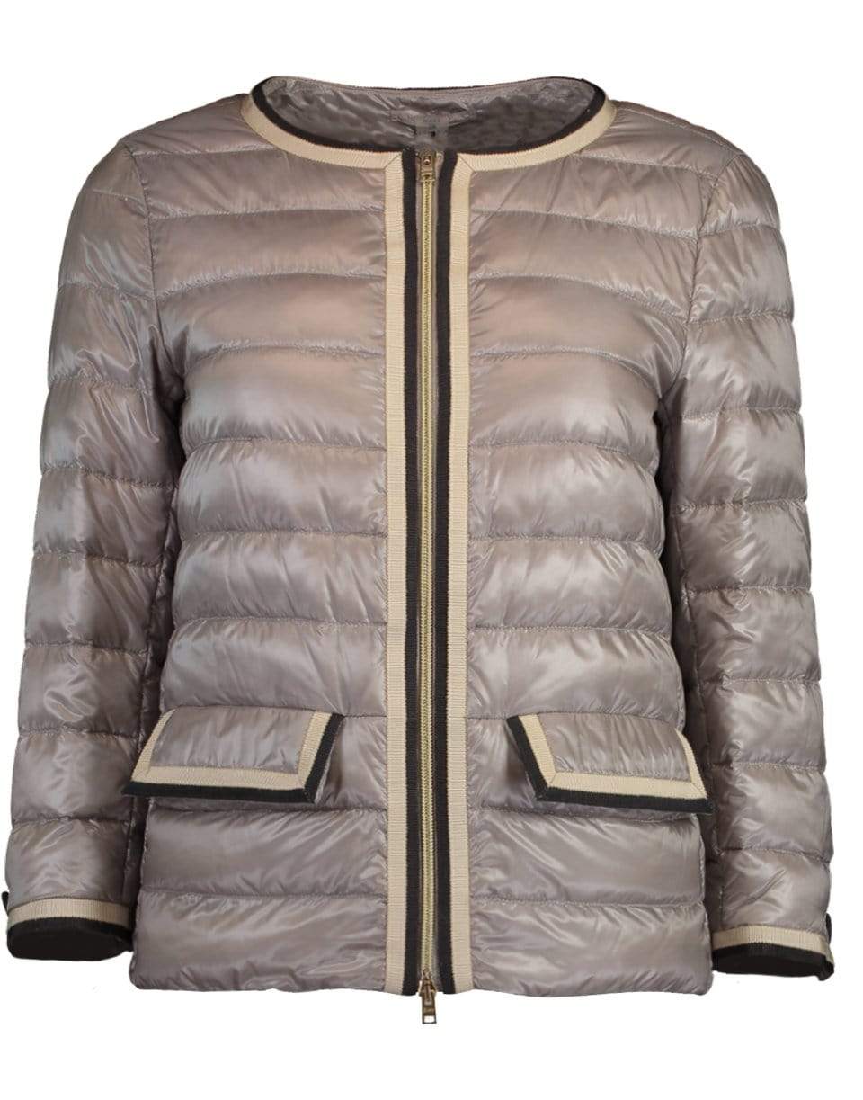 Herno Chanel quilted down jacket featuring a slim fit, 3/4 length sleeves with a button, front flap pockets, round neck, contrasting trim, and two way zip closure.
