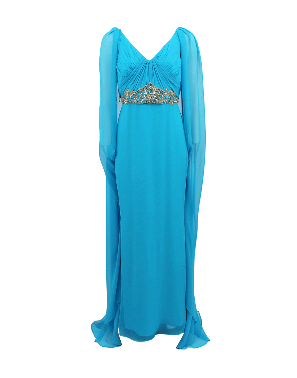 Make an angelic statement with Egyptian royal essence in Notte by Marchesa's chiffon embroidered draped gown. Accent this elegant gown simply with drop earrings and strappy stilettos.