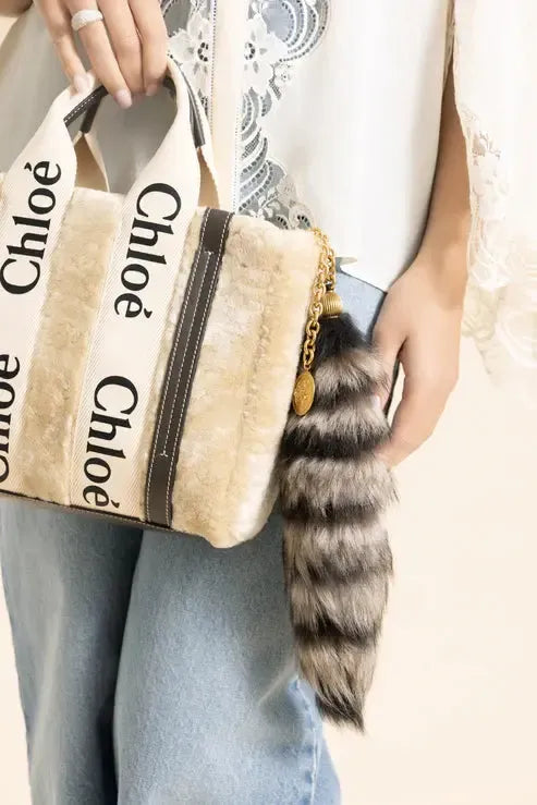 Chloe raccoon tail charm in taupe beige.