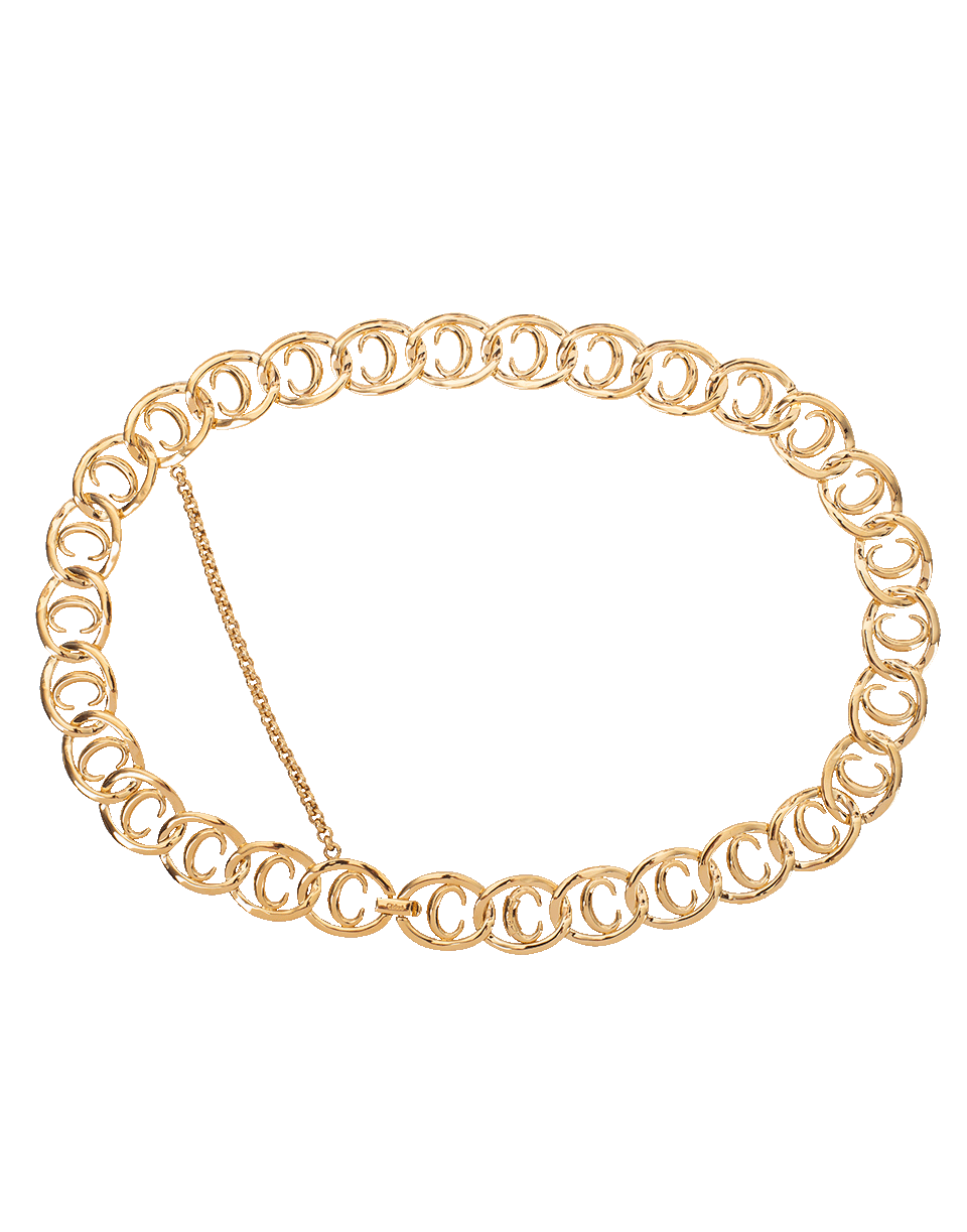 Gold chain belt by Chloe. This chain belt is crafted from gold tone metal and is decorated with 'C' monogram links. It has a clasp fastening that latches onto an adjustable chain. Designed to be worn at the waist over a dress or with trousers.