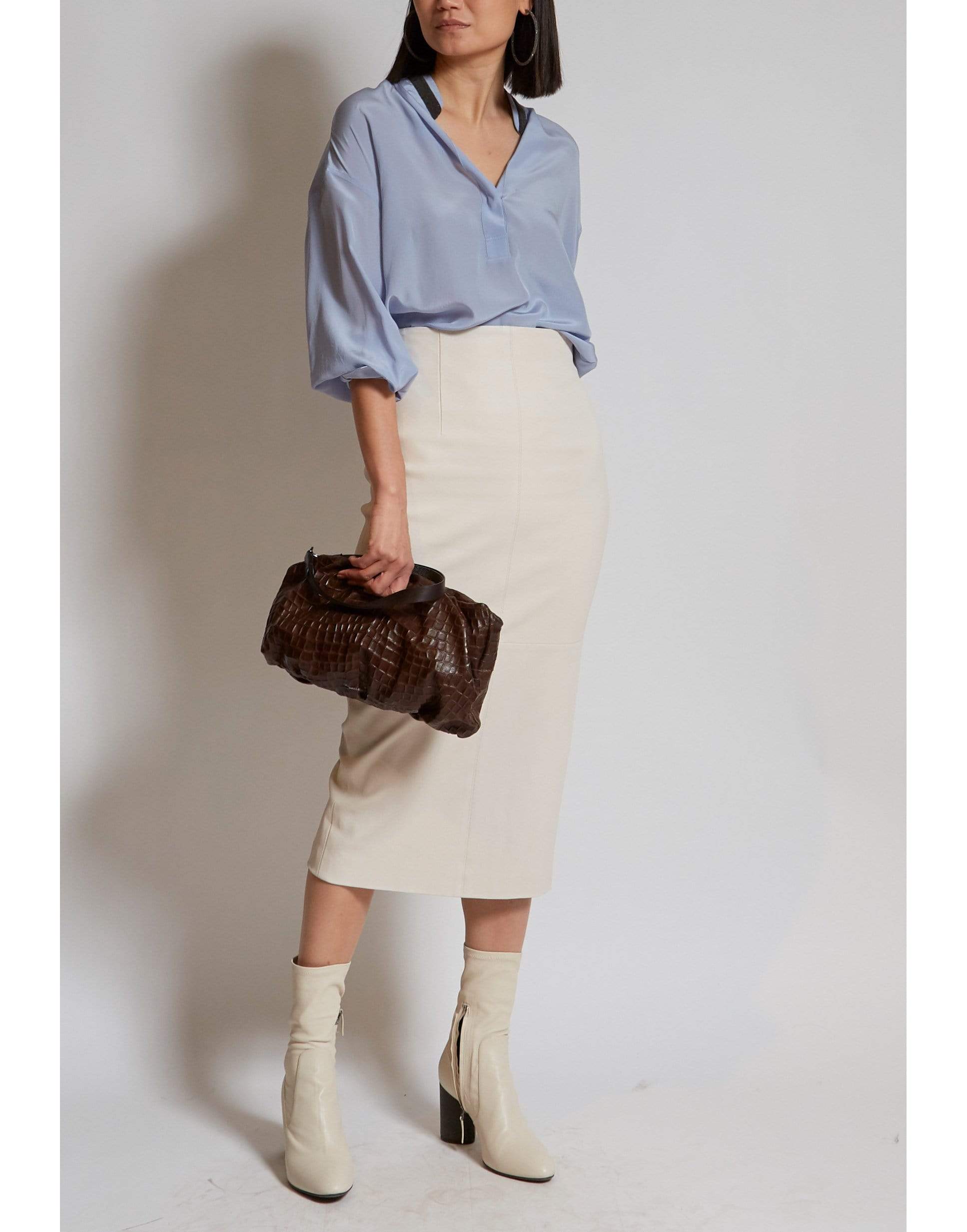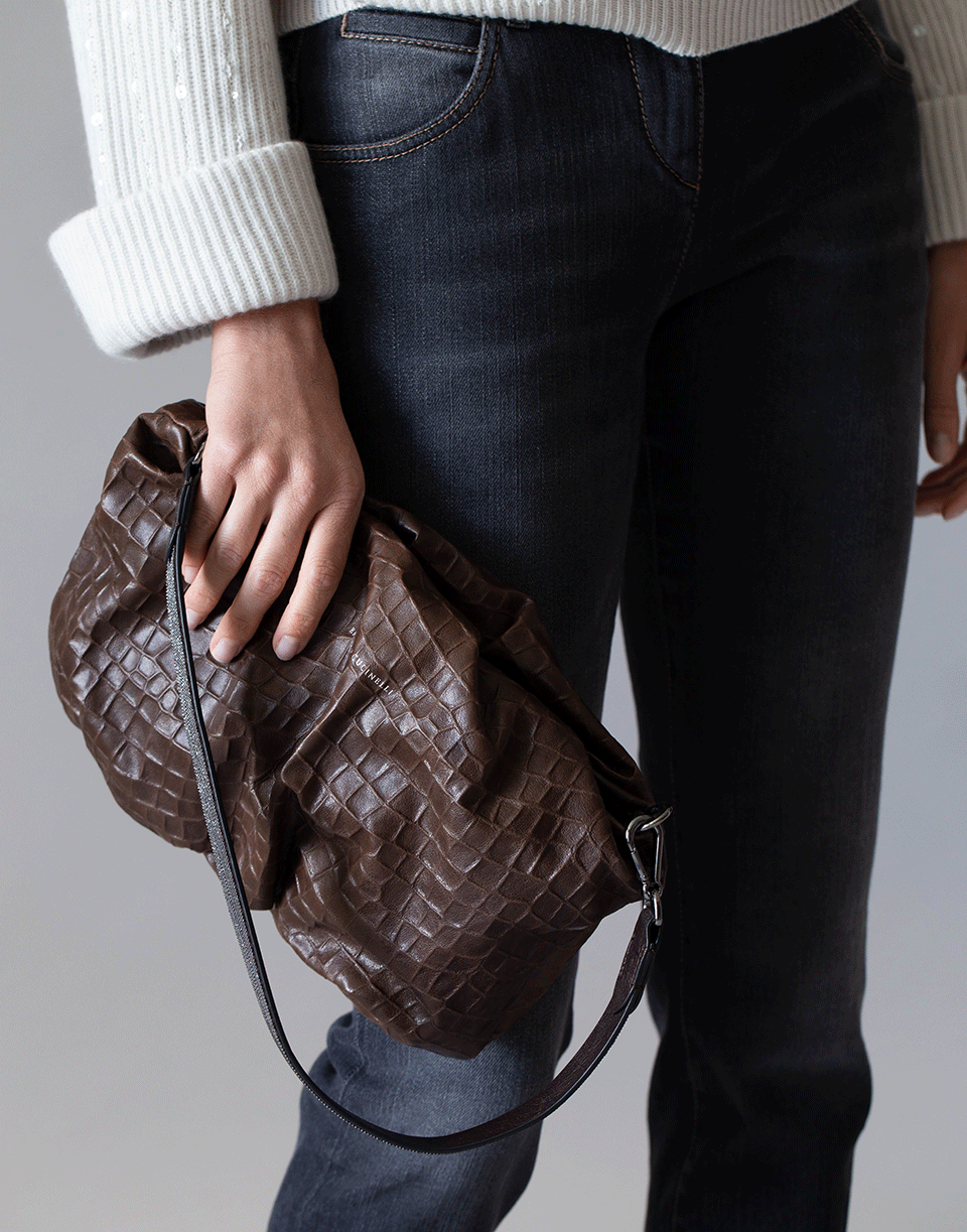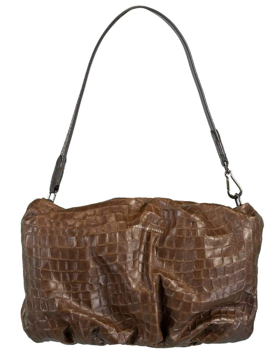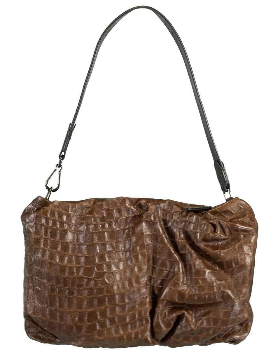 Brunello Cucinelli chocolate soft embossed croc baguette monili strap pouchette featuring a main compartment with a zip closure and an interior pocket.