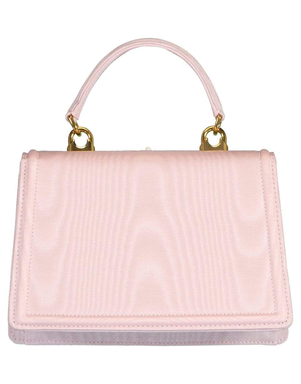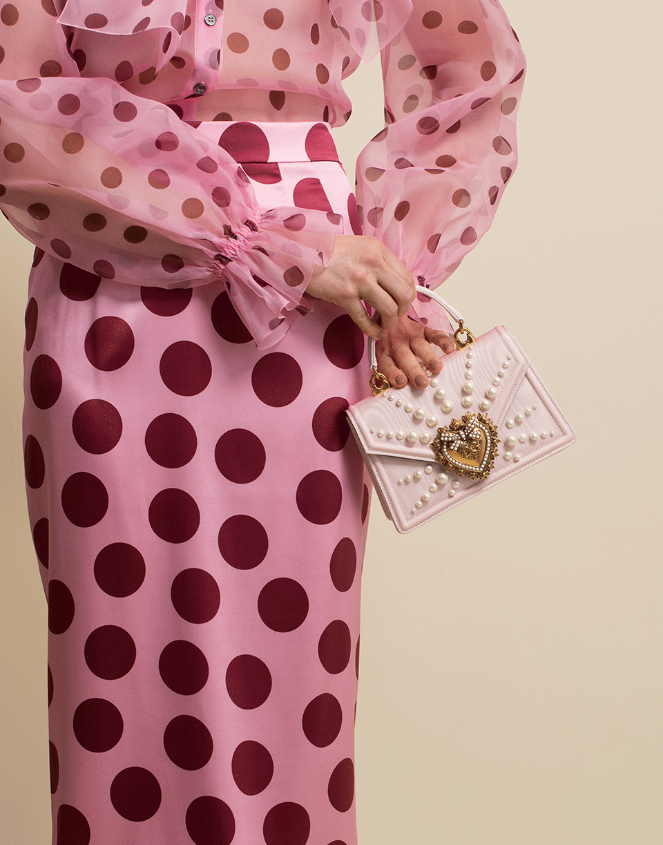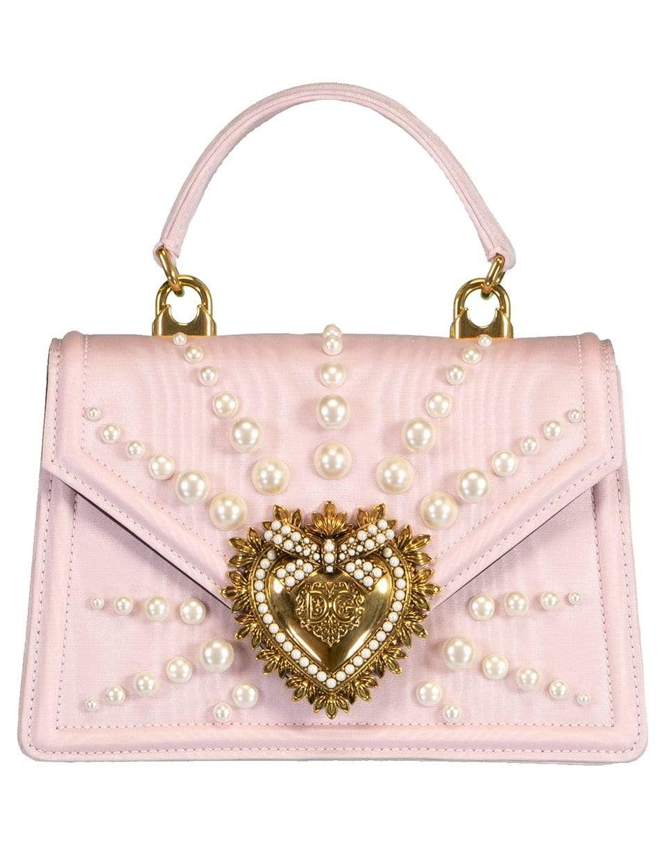 Dolce & Gabbana small Devotion Bag featuring a top handle, envelope flap with the label's signature heart emblem, pearl details at front, and an interior slip pocket.