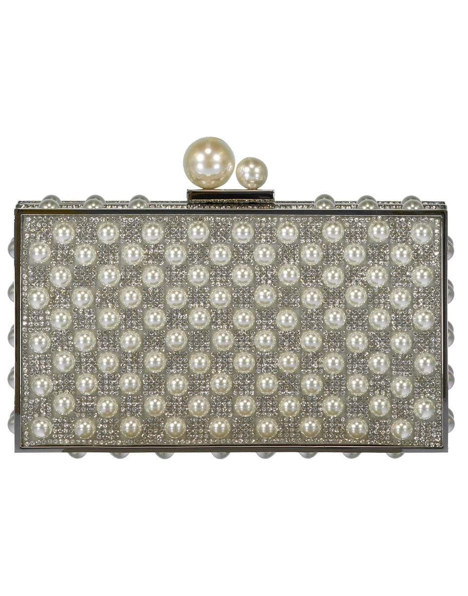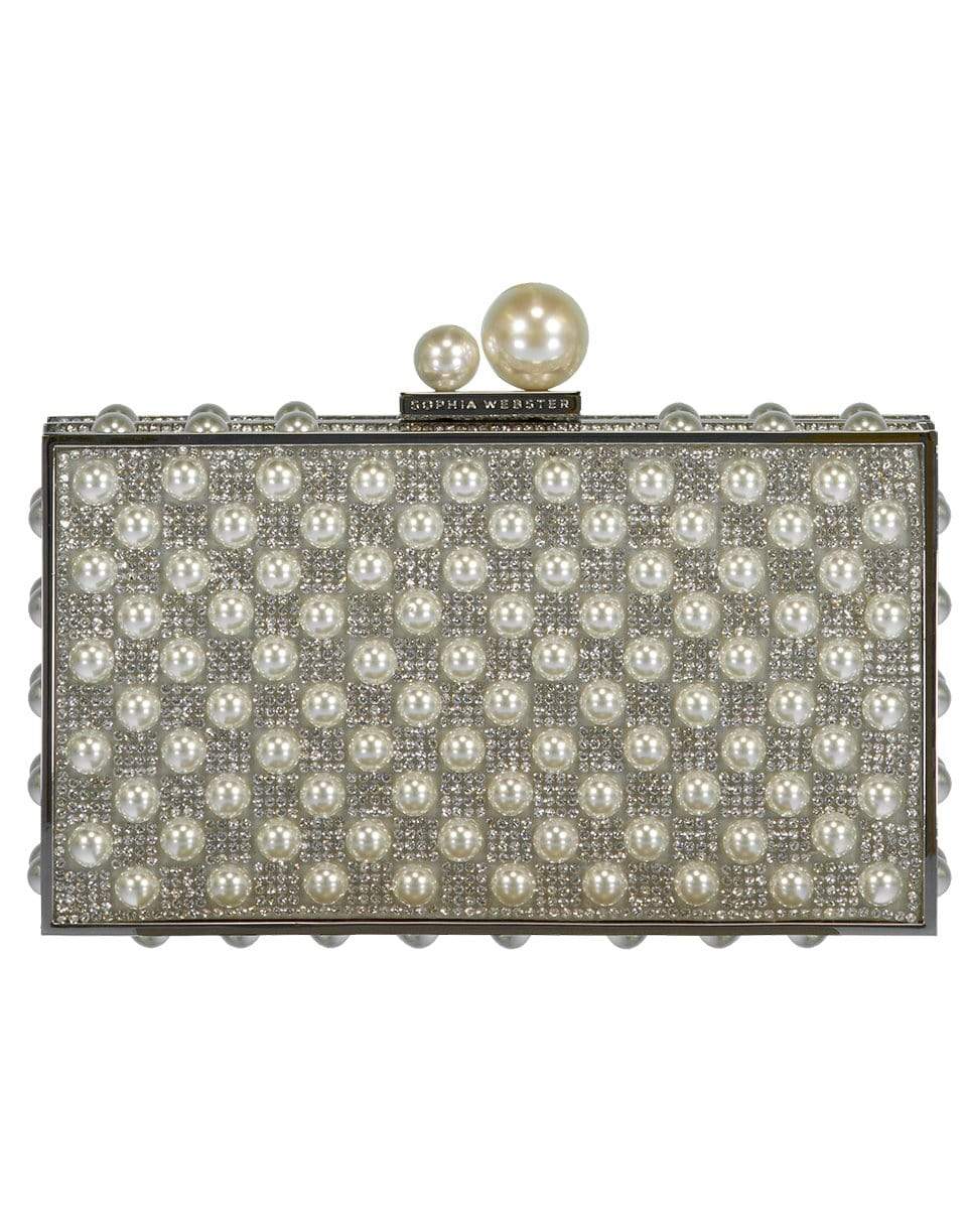 Sofia Webster Clara box bag with a hard shell crystal encrusted and pearl exterior, silver-tone metal trim, bail clasp closure, and lined with satin. Finished with a detatchable chain strap.