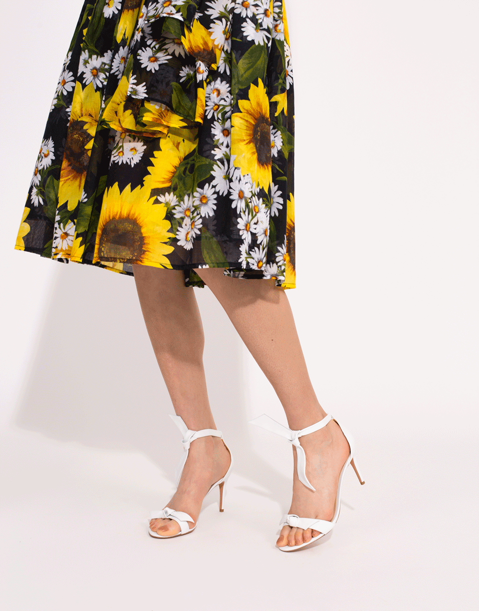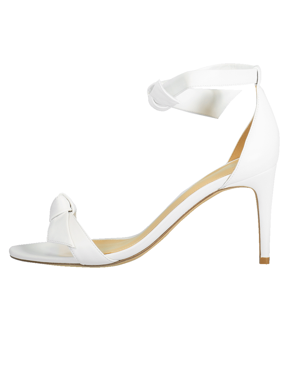 White leather sandals by Alexandre Birman. These soft leather 'Clarita' sandals feature an open toe style, bow-embellished straps, leather insole and outer sole and a 3” heel.