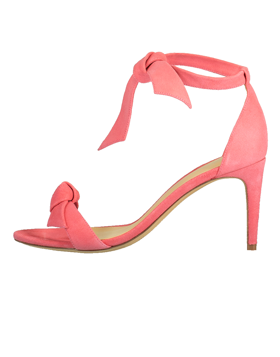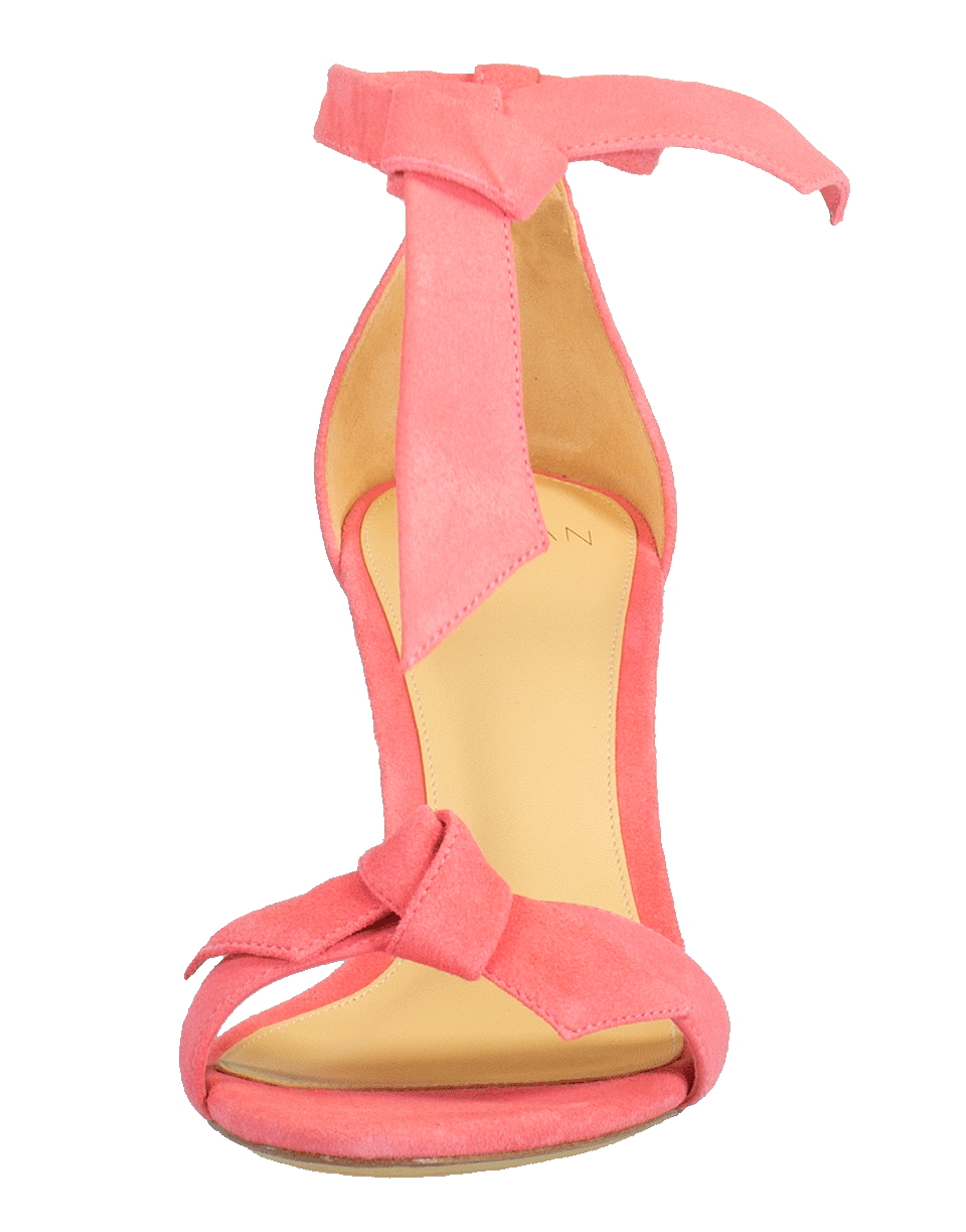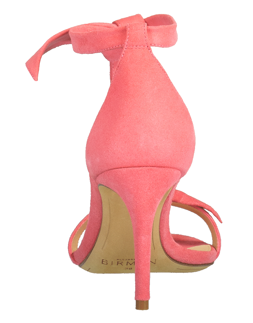 Pink suede sandals by Alexandre Birman. These suede 'Clarita' sandals feature an open toe style, bow-embellished straps, leather soles and a 3” heel.