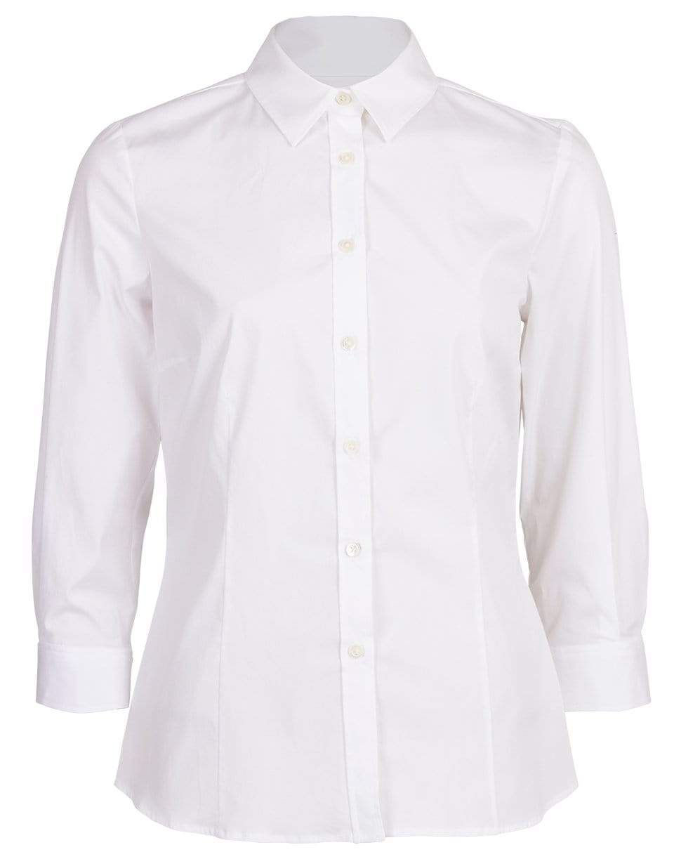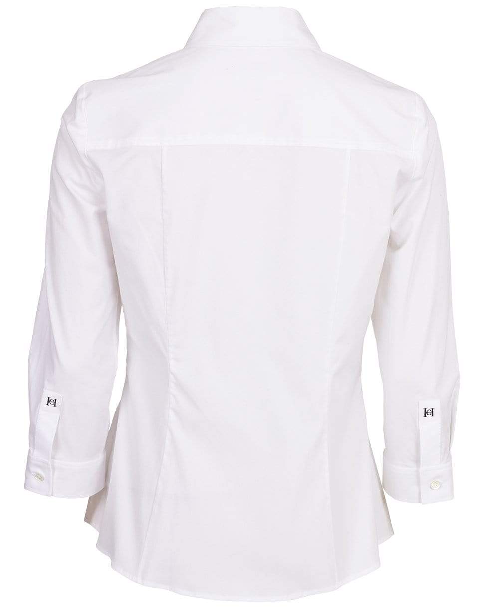 Classic 3/4 length sleeve collared shirt from Carolina Herrera featuring a spead collar, button front, and 3/4 length sleeves.