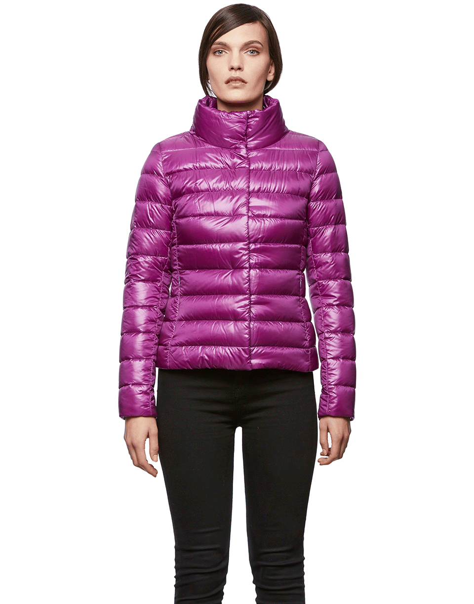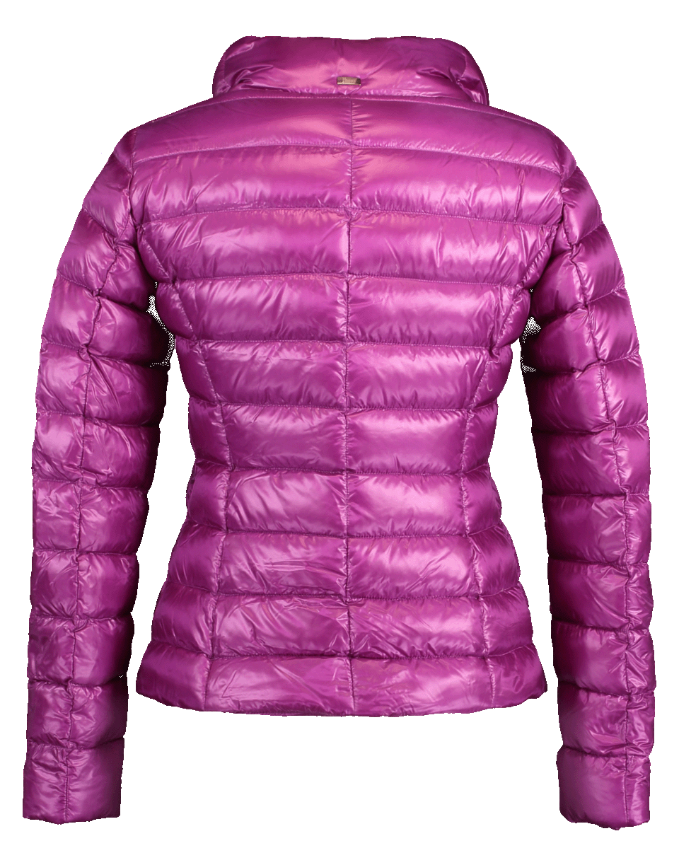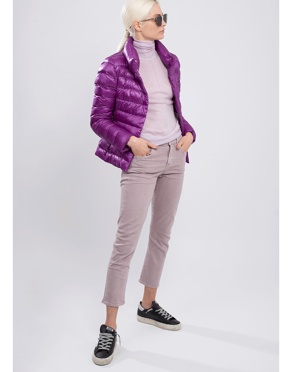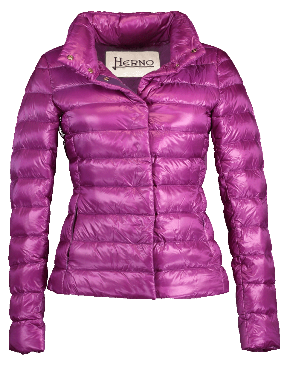 Purple nylon puffer jacket from Herno featuring long sleeves, high neck, concealed snap button closures, zip side pockets, and a fitted silhouette.