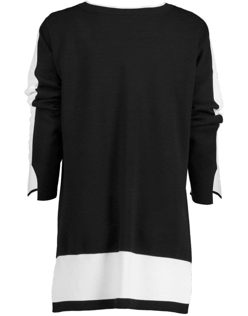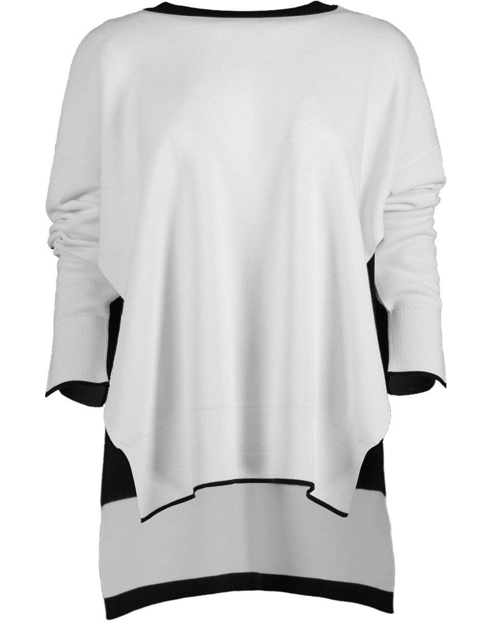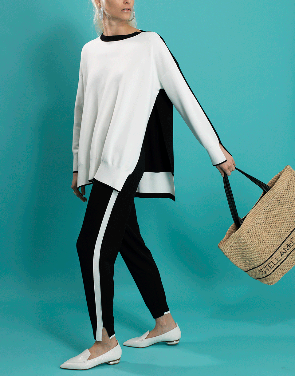 Stella McCartney compact knit color block pullover with a round neckline, long sleeves, ribbed trims, and a split hem.