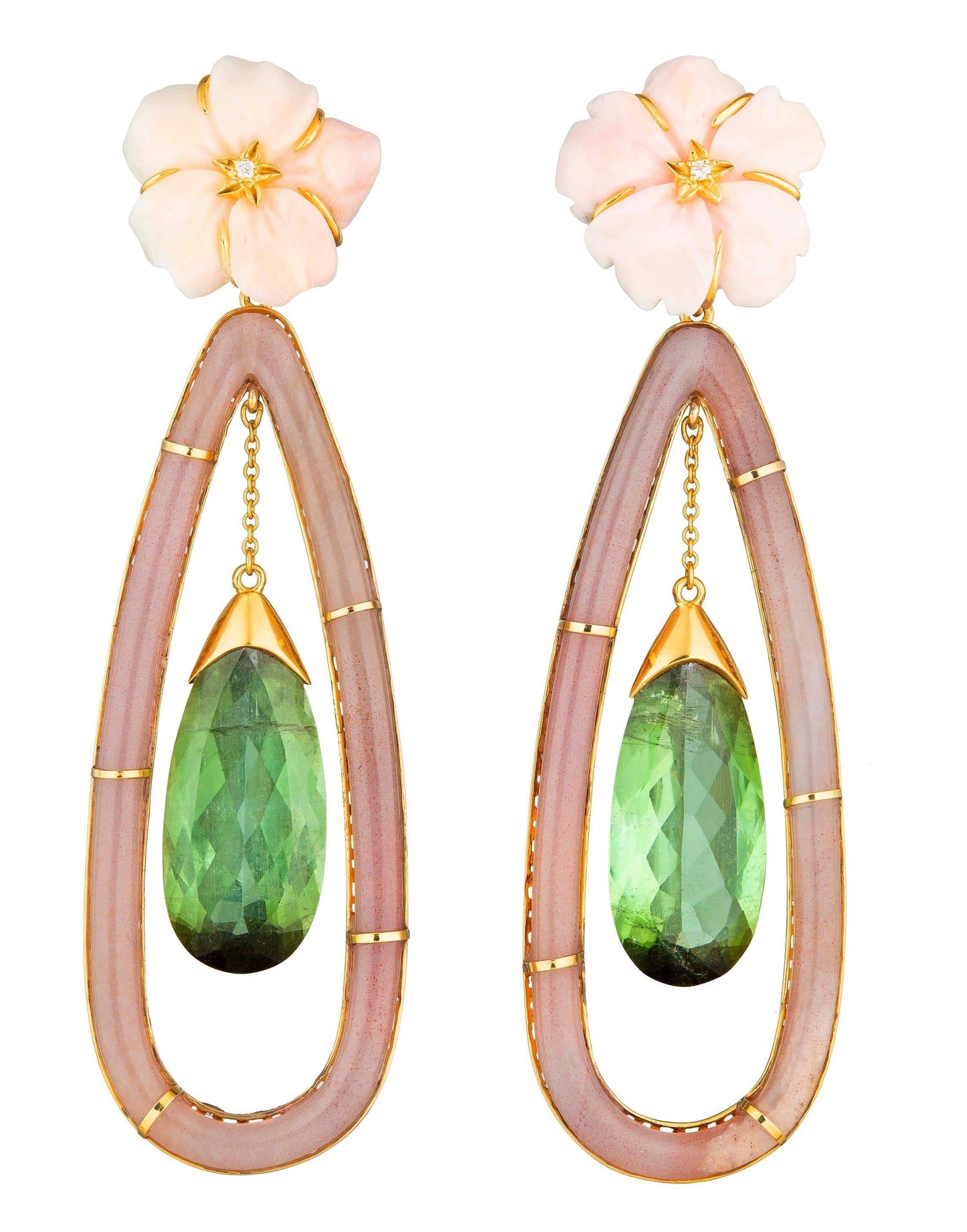 Guita M conch flower earrings with gold-backed carnelian loop with green tourmaline drops. For pierced ears.