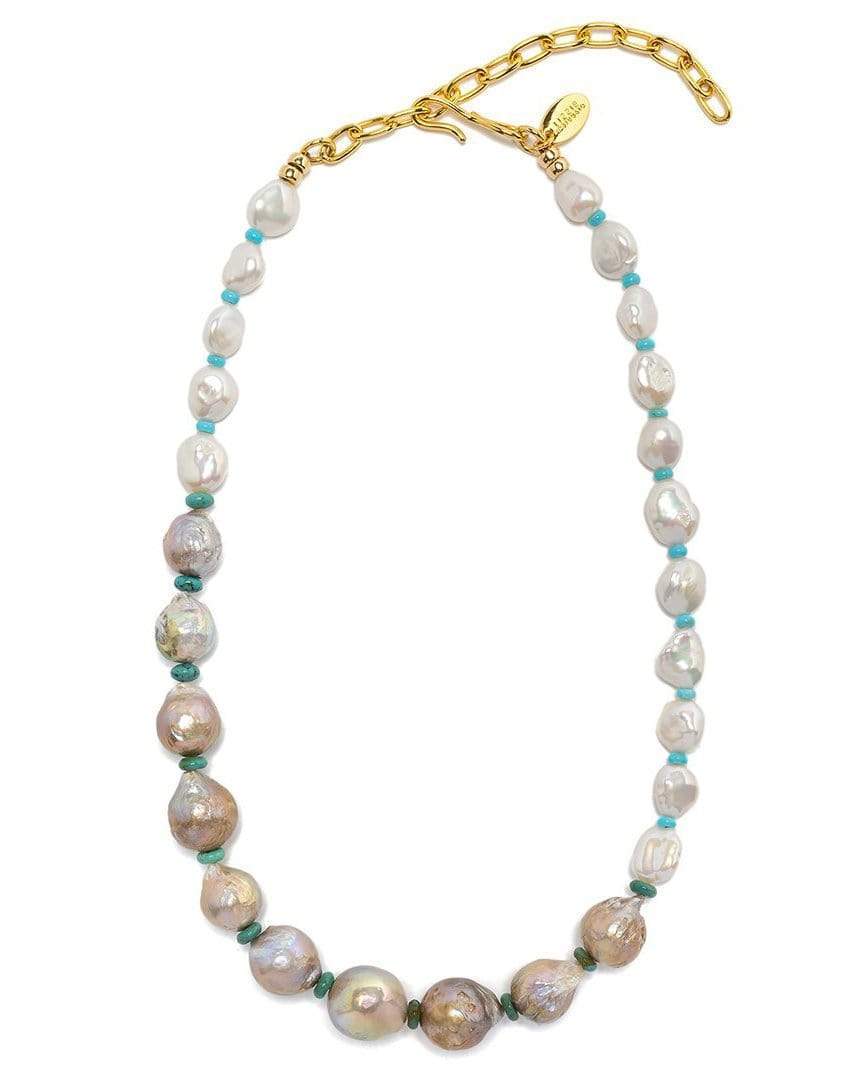 Lizzie Fortunato cool summer pearl necklace. Play it cool in the necklace of the season. This single-strand statement piece with white and gray graduated freshwater pearls and turquoise bead details looks stellar on its own or layered into a treasured tangle.